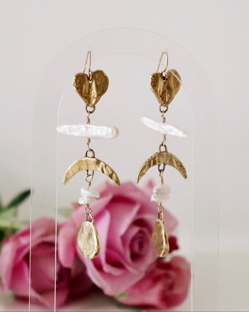 These elegant Gold Celestial Ladder Earrings are fit for a goddess. Shining with freshwater pearls, the heart, crescent, and moon shapes cascade down - seamlessly blending together and evoking a celestial atmosphere. Perfect for any special occasion, these earrings are sure to make a statement.