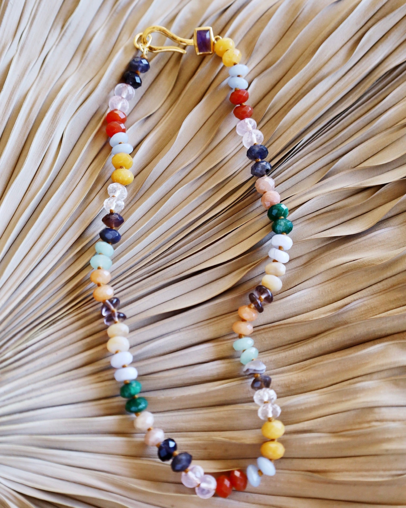 A hypnotizing mix of vibrant multi colored semi-precious gemstones adorn this necklace featuring a rectangular amethyst and gold hook detail. Perfect on its own or layered with a statement pendant necklace.