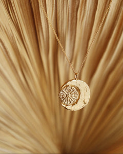 A crescent moon embraces a rotating sun, symbolizing the balance of divine forces and universal order. Wear Phébé to protect you, day and night. This necklace is part of our Kínisi collection, a series of moving and rotating jewelry.