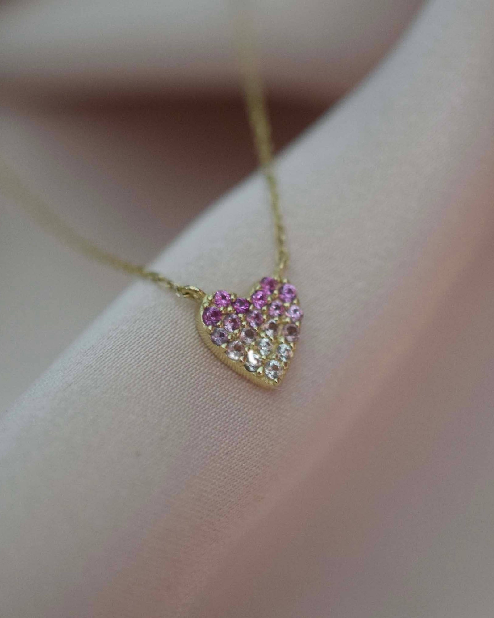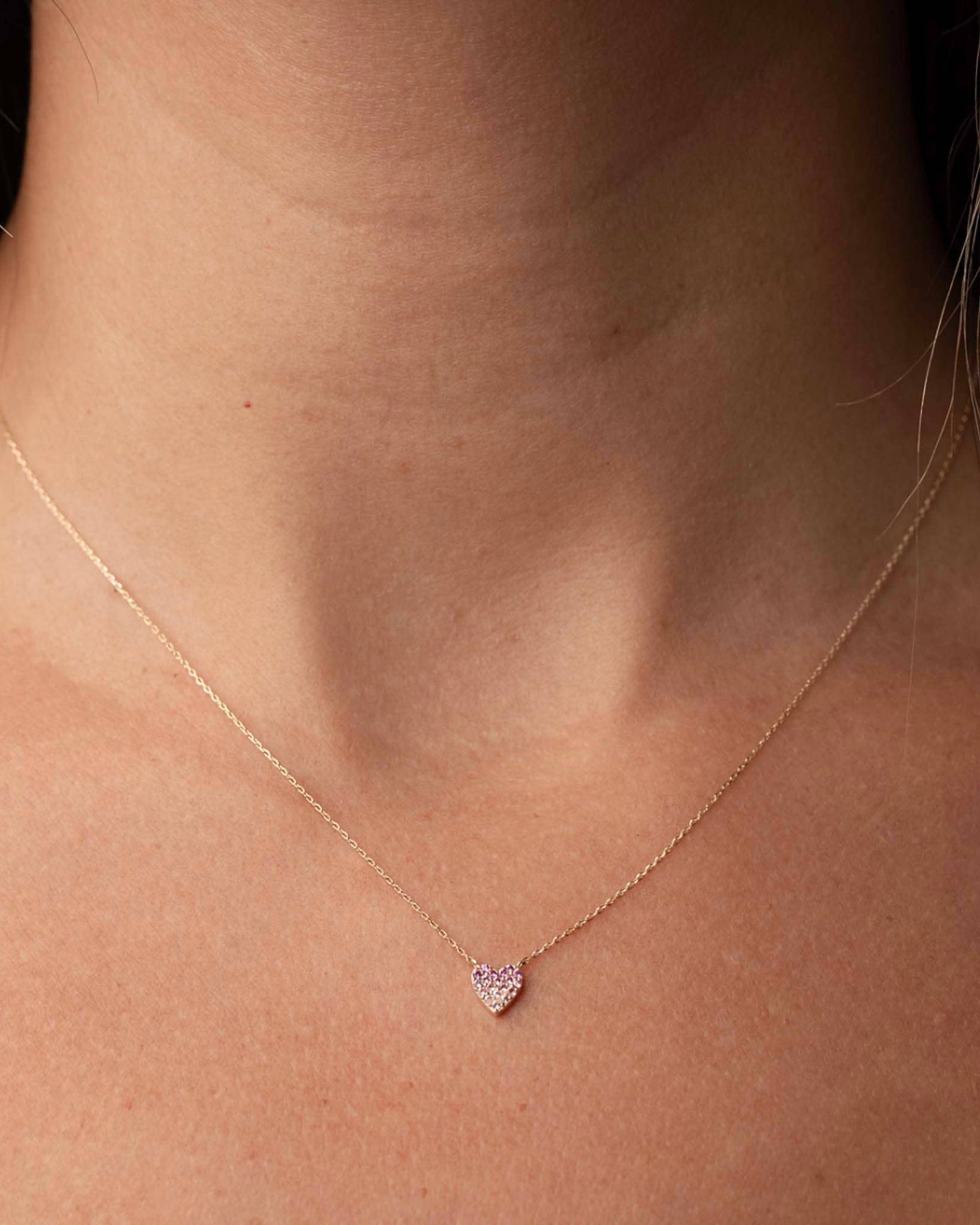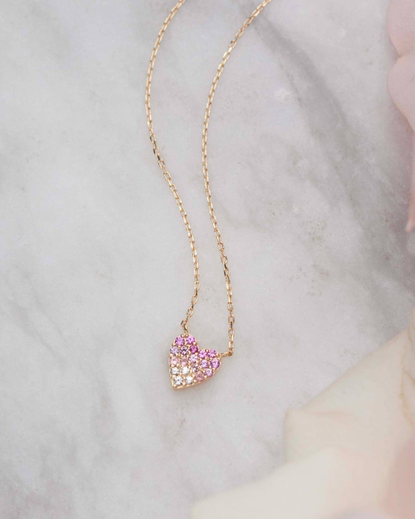 Crafted in solid 14-karat gold, this delicate necklace features a harmonious blend of natural pink and white sapphires in a heart design. The adjustable 16" to 18" length accommodates various necklines, while the gemstones' soft hues evoke timeless elegance and romance. An expertly executed piece that celebrates refined taste and enduring beauty.