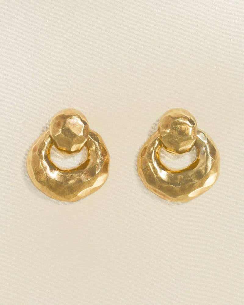 Vintage-inspired yet strikingly modern, the Kalista sculptural doorknocker earrings feature voluptuous curves and a chunky, hammered hoop—almost faceted—that moves within its frame. Height : 17 mm (0.67") Width : 14 mm (0.55") Weight : 9 g Gold gilded (gilding : satin) Ethically made in France Keywords