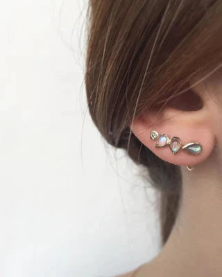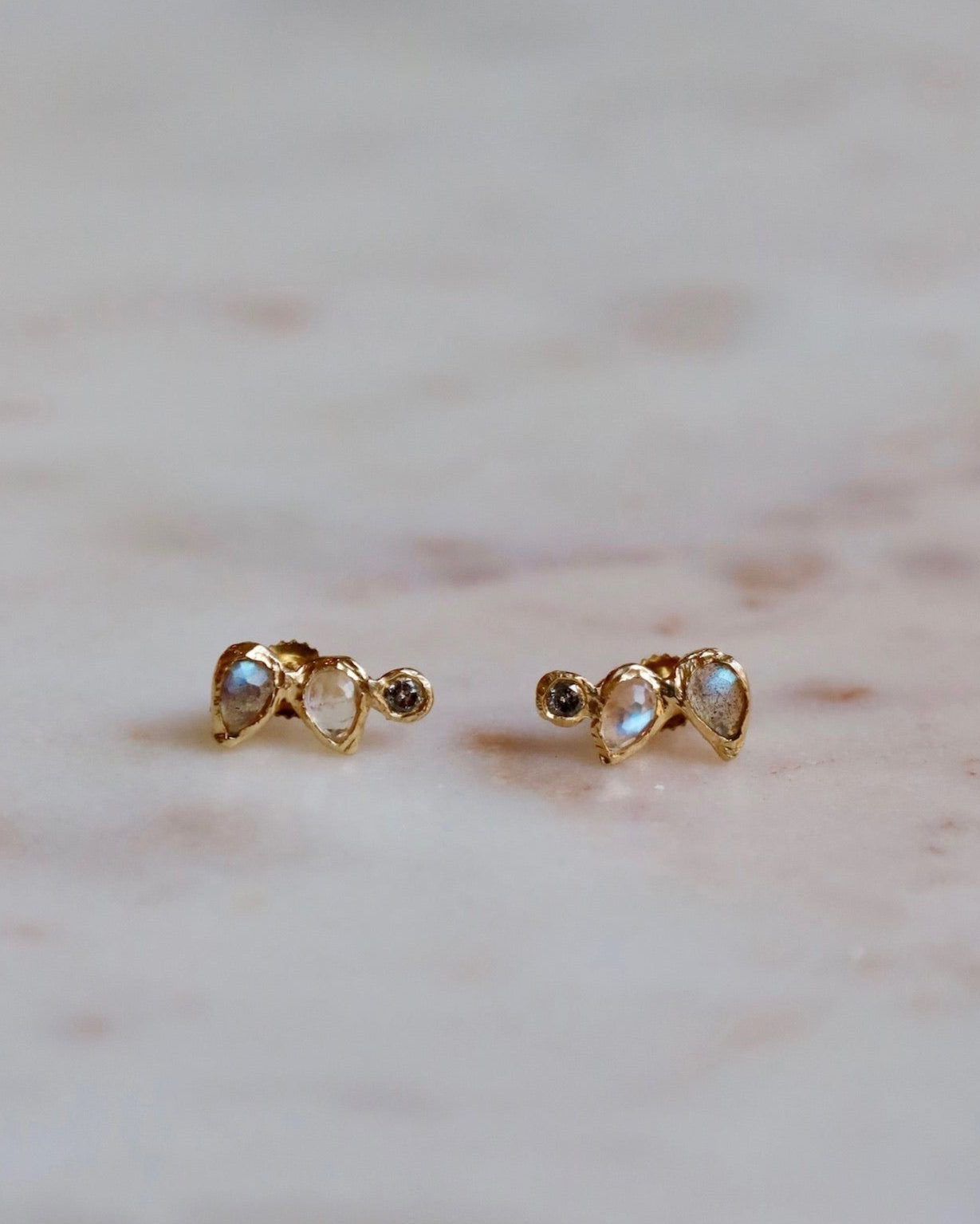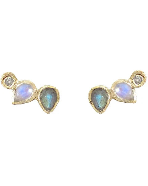 Grey diamond, labradorite and rainbow moonstone reflect the beauty we have within and shine out. Earring measures approximately 10mm. Grey round brilliant diamonds 0.06cts.