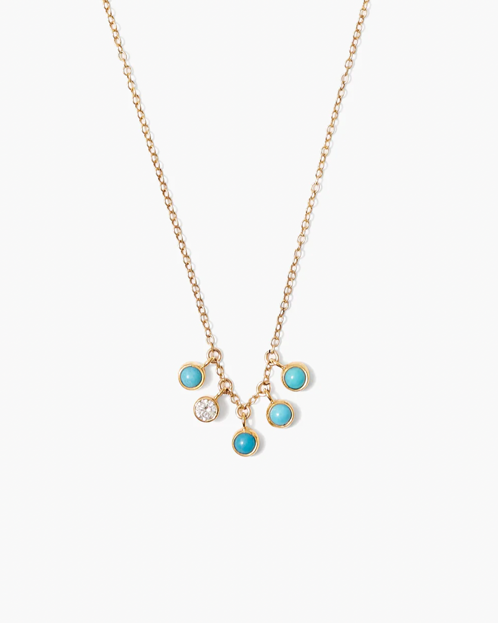 Gold necklace with bezel wrapped turquoise micro beads and a white diamond.