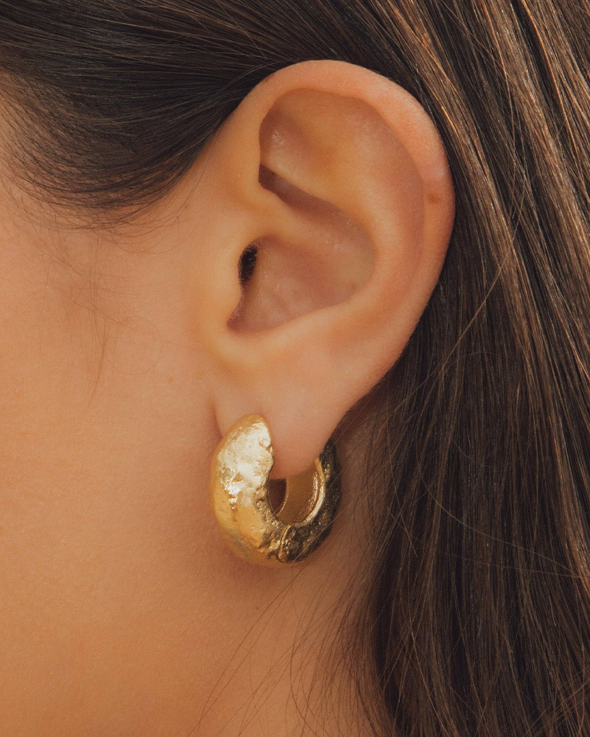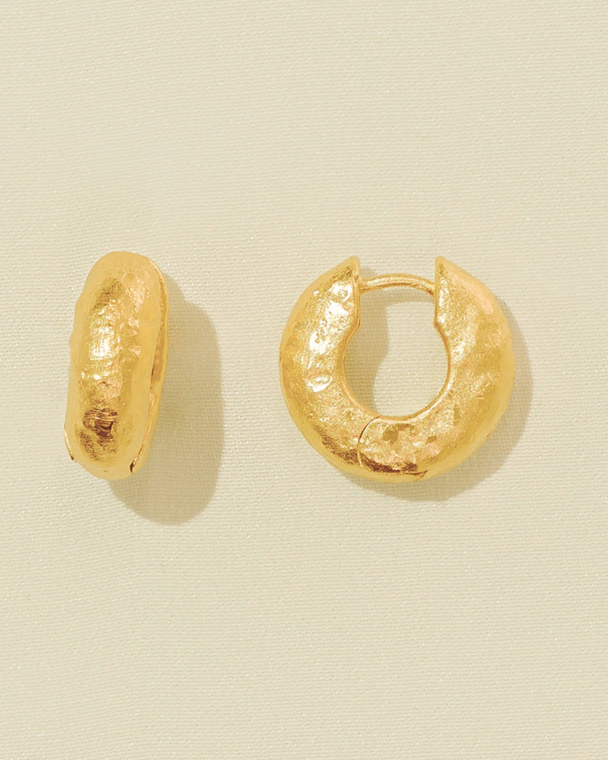 A new addition to your everyday staples. Our Anilla hoops are bold yet minimalist, classic but always exciting. The hammered and textured finish will capture the light around you and make you shine. Available in 3 sizes. Diameter : 23 mm Gold plated (gilding : satin)