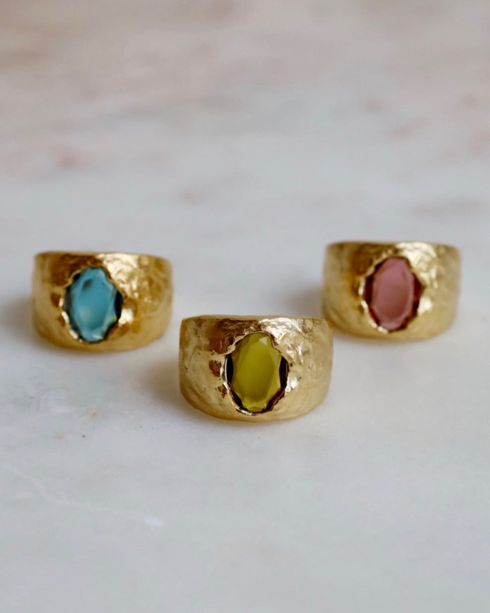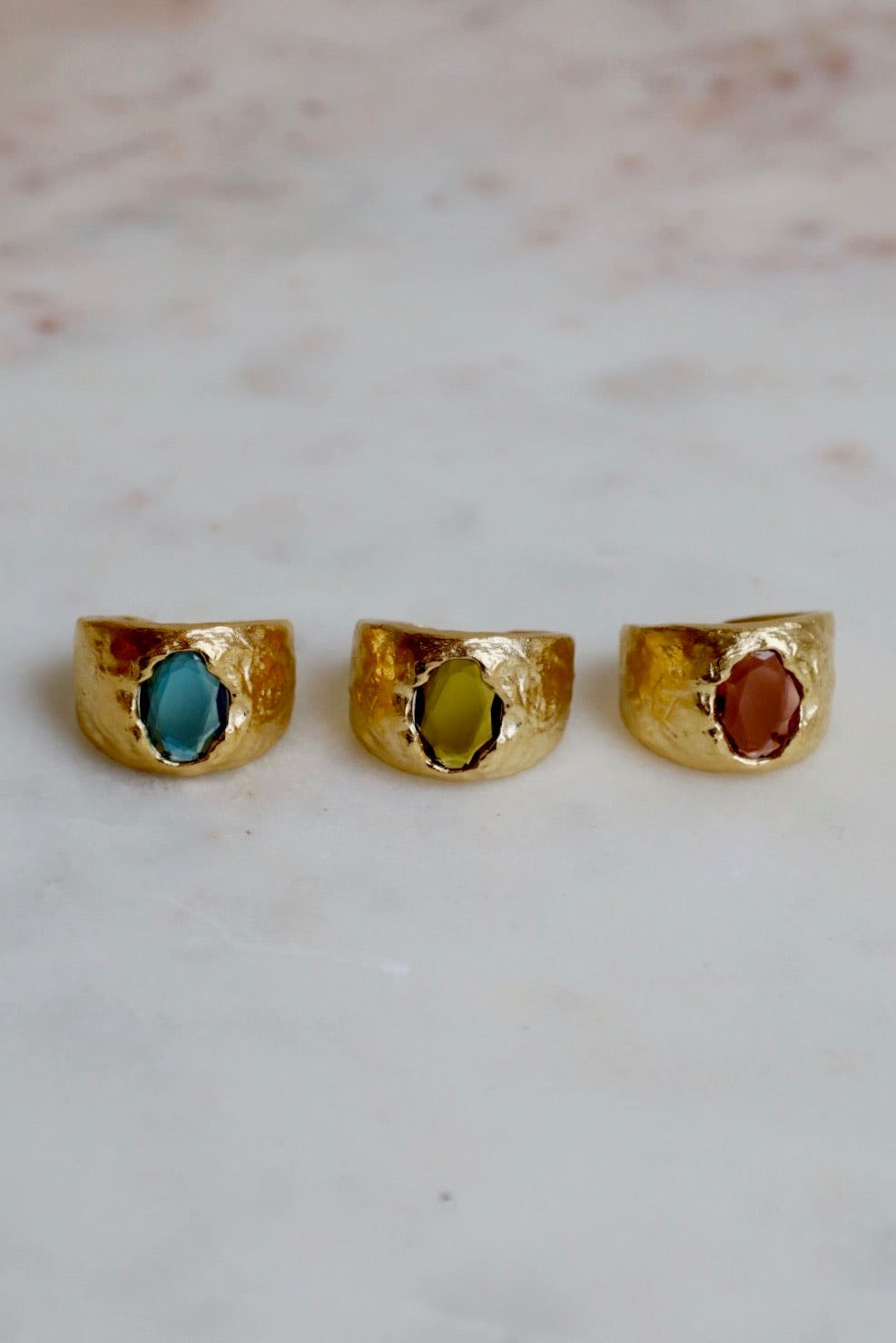Carmen is our new powerhouse. With its hammered look and striking stone in the middle, this ring will become your compass, guiding you through life's mystery. Width : 15 mm Inside diameter : 17.2 mm Opening : 4 mm Stone : Cerulean Glass stone Gold plated (gilding : satin) Ethically made in France.