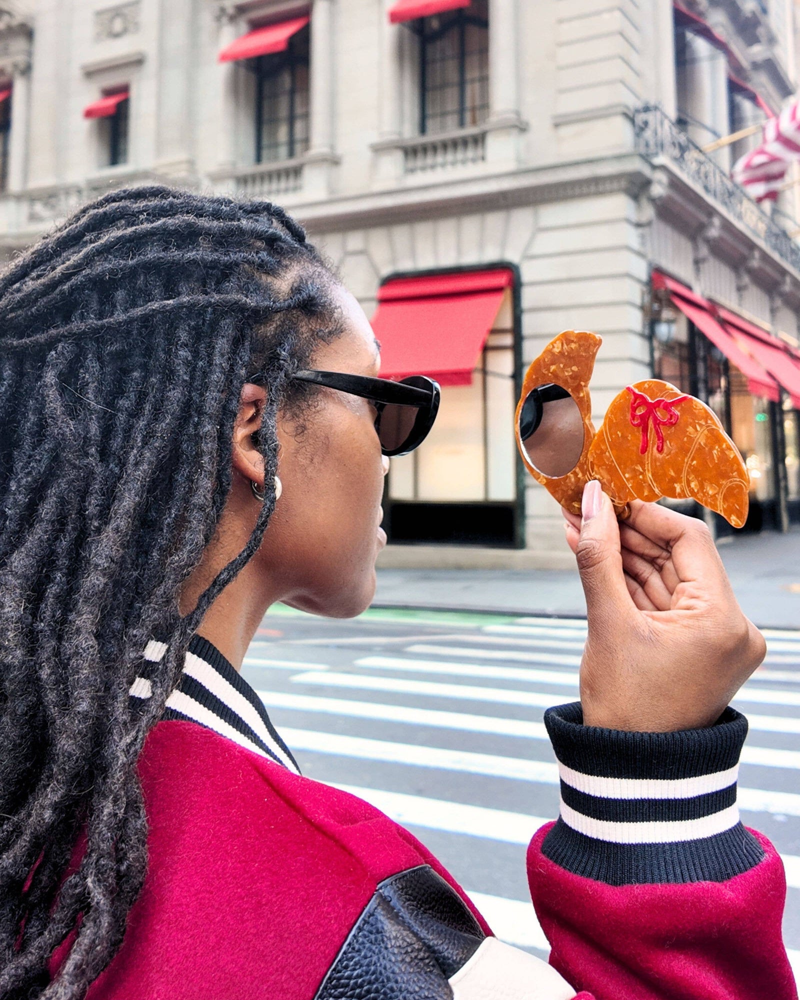 It’s pretty enough to flash and small enough to fit in even your tiniest baguette bag. Each mirror features an original, hand-painted design created by Solar Eclipse artists. The Bow Croissant style is sculptural, playful, and full of personality—turning an everyday object into a signature accessory. Made from our signature biodegradable acetate and packaged sustainably, it’s a timeless piece created to be treasured.