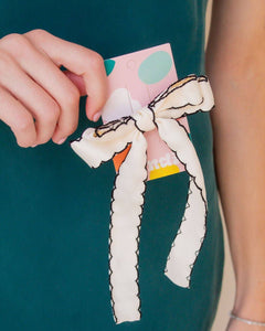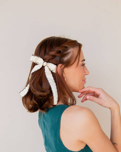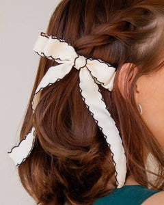 Every shop Andi accessory is specially designed to be comfortable, stylish, and practical, and our bows are no exception! This medium bow clip is absolutely a must. Made with a cream ribbon, featuring a black scalloped trim, it matches any hairstyle and outfit, seamlessly, and attached to an alligator clip, it's so easy to apply.