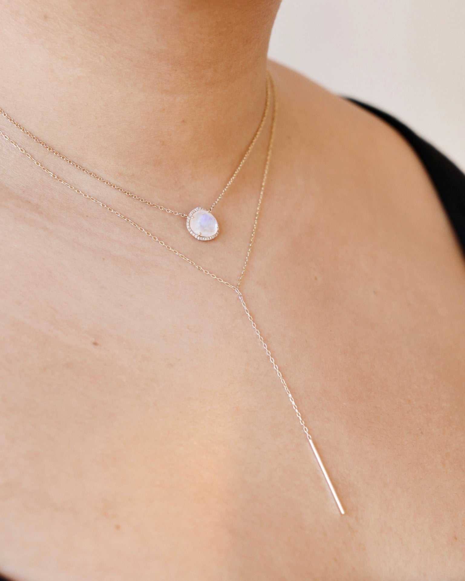 14k solid gold, pave diamond, and a beautifully handpicked free form moonstone, hanging from a 16"-18" adjustable chain. Timeless and perfectly handcrafted, wear it up or down, by itself or layered.