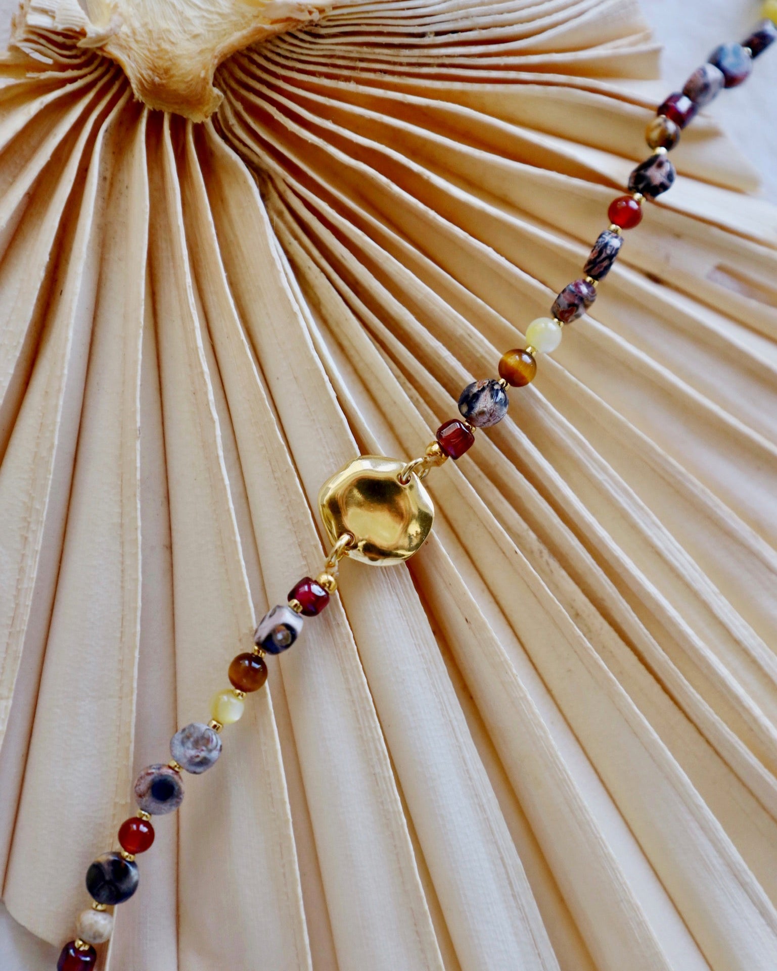 - 18k gold plated sterling silver, leopard skin jasper, yellow mother of pearl, red garnet, picture jasper, dyed red jade, tiger's eye.
