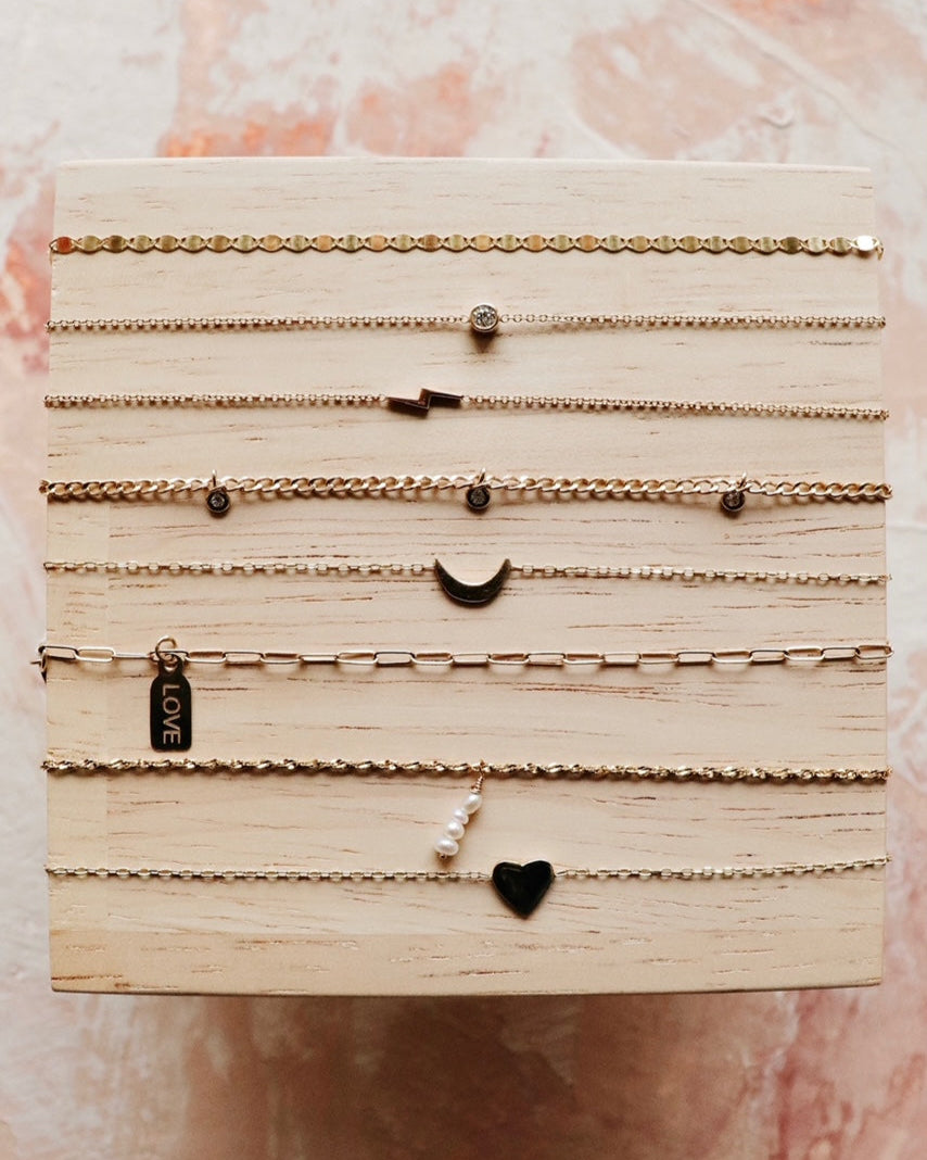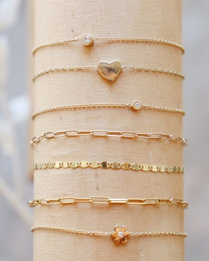 Beautifully handcrafted small diamond in a 14k gold small bezel cup laying on a dainty cable link chain bracelet.