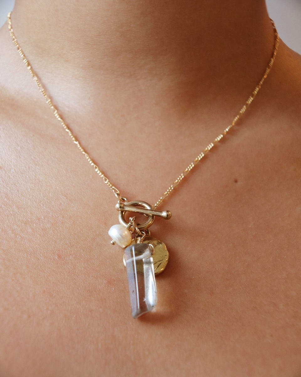 This glowing Selene Gold Charm Necklace is the perfect accessory for the goddess within! Sophisticated yet sweet, this lovely layered look features a pearl, quartz crystal, and hand-carved medallion that glimmer against a delicate figaro chain and gold toggle clasp. Summon your inner moon goddess and show off your stylish shine!