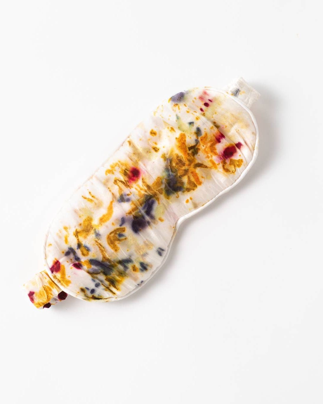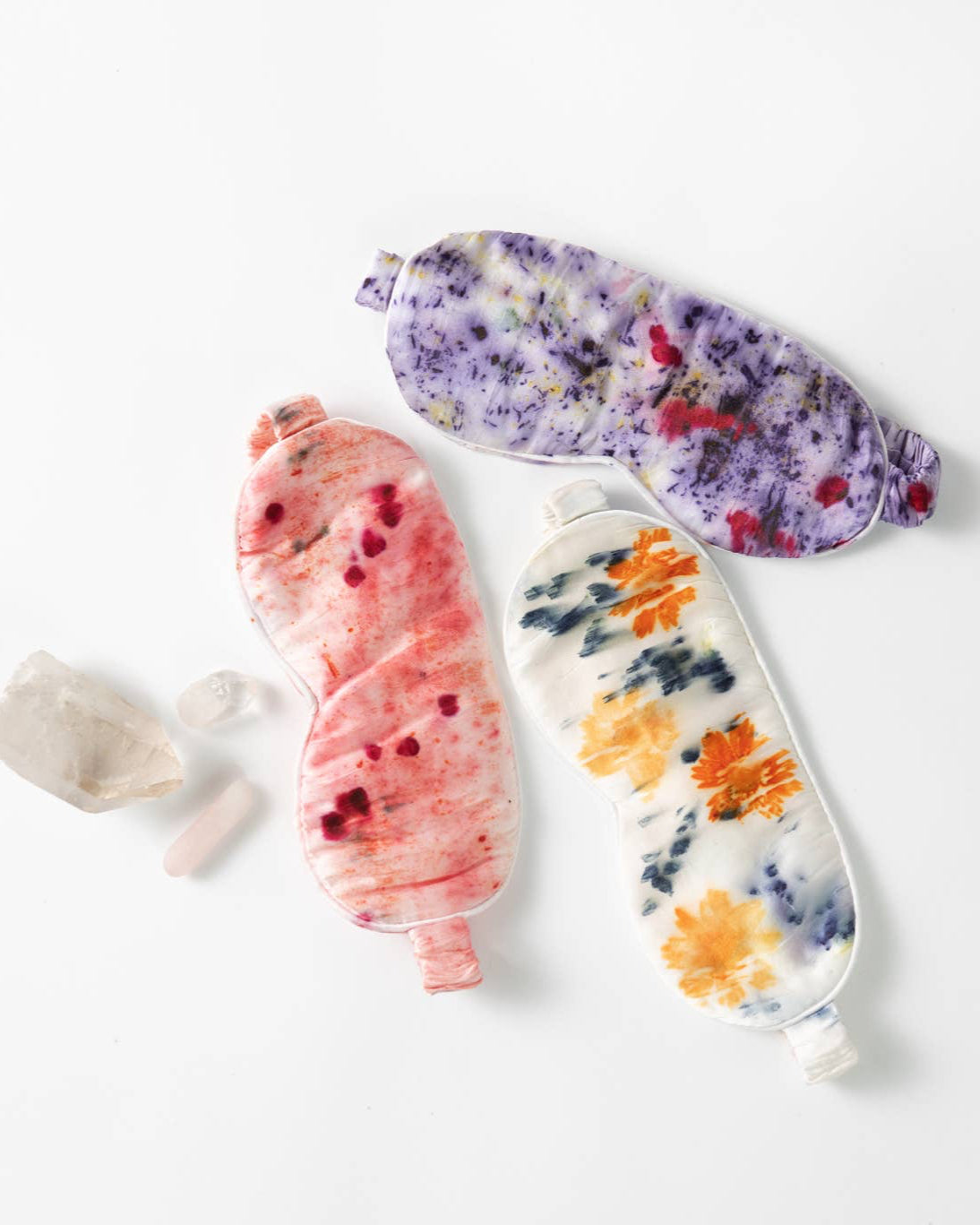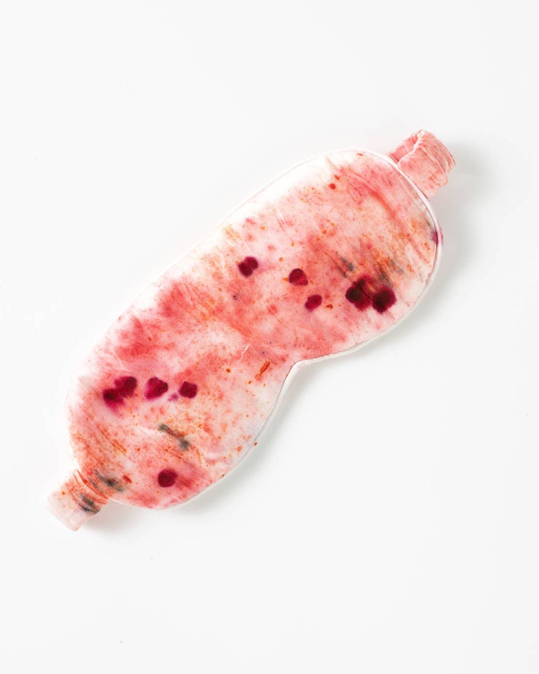 Silk sleeping mask pink motif botanically dyed with flowers and plants. Designed to block out light. Soft silk and silk-covered elastic band. Pair it with a set of silk pillowcases for the ultimate sleepy luxury!