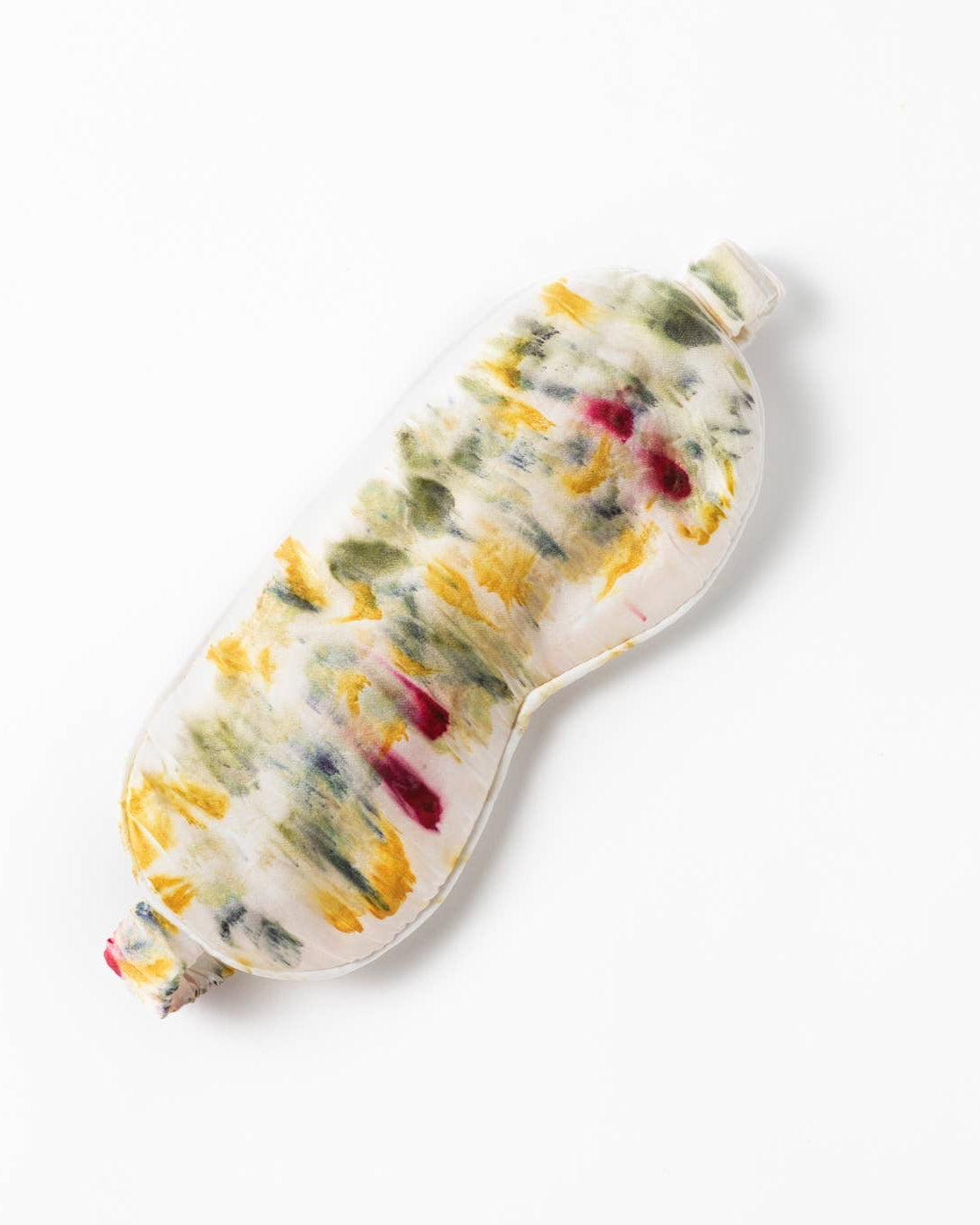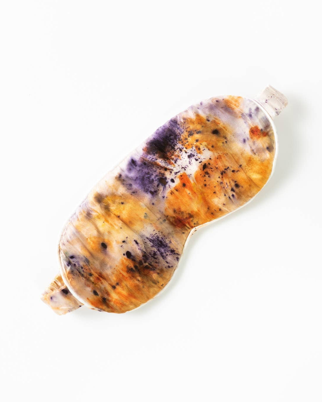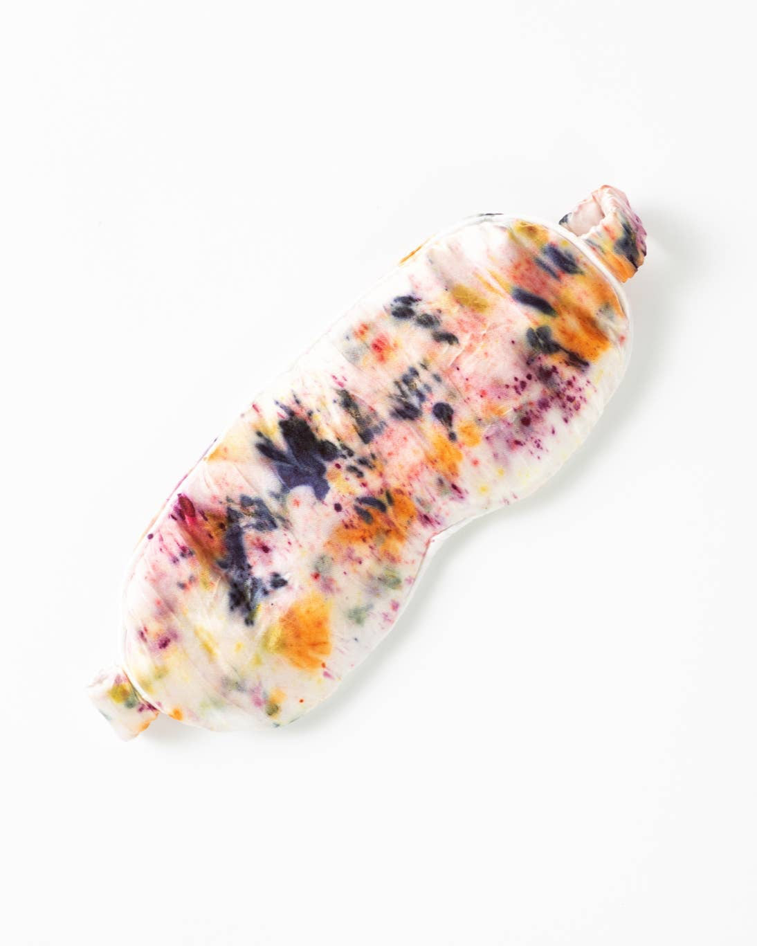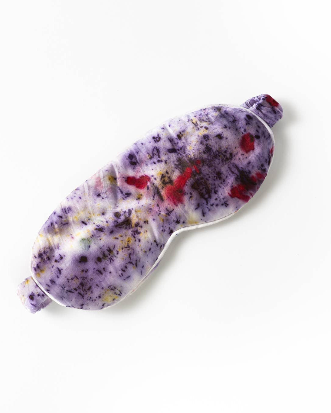 Silk sleeping mask pink motif botanically dyed with flowers and plants. Designed to block out light. Soft silk and silk-covered elastic band. Pair it with a set of silk pillowcases for the ultimate sleepy luxury!