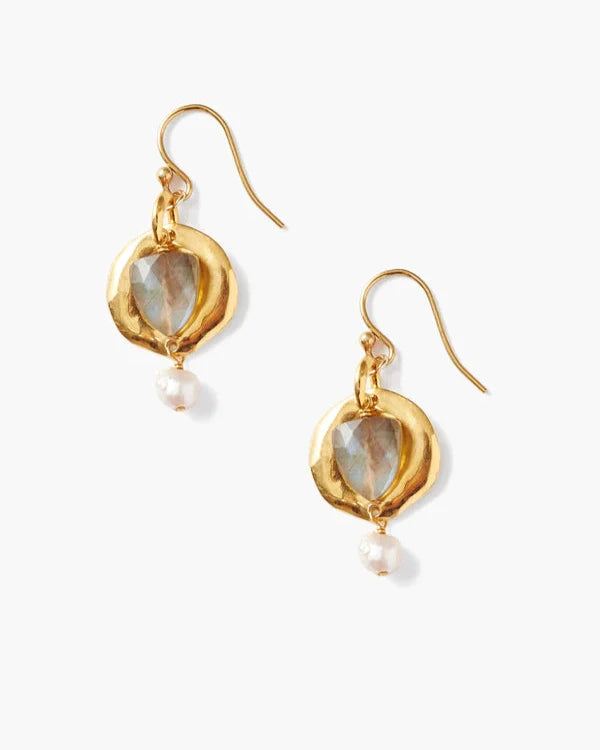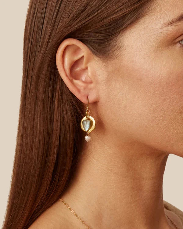 White blister pearls dangle from labradorite 'oysters' nestled in a hand-hammered gold shells in these stunning drop earrings.
