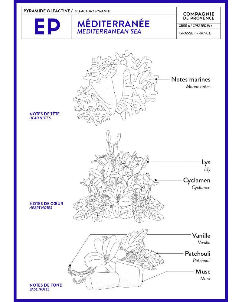 Fragrance of the Mediterranean air combined with the freshness of sea spray with delicate scents of sunny flowers. Fragrance created in Grasse.