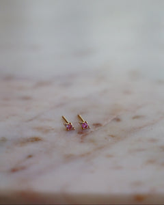 These Pink Sapphire Dainty Triage Studs are crafted from 14kt gold and feature natural 2mm and 1mm pink sapphires for a delicate, yet stunning design.