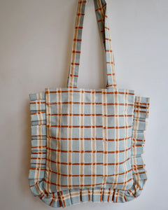 An easy-to-wear statement piece handmade from hand block-printed cotton canvas with frill detailing that reminds us of Momos; our favorite Nepali street food. Perfectly practical for everyday use, carrying all your essentials with a unique, playful twist.