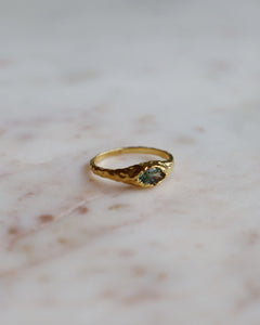 Maria Mini is a thin dome ring with a hammered surface and a faceted oval blue-green stone set into raw, textured gold. Its irregular finish highlights the contrast between metal and stone. Width : 6 mm (0.22") Inside diameter : see size guide Non-adjustable and available in 3 sizes Stone : Celadon Cubic Zirconia Gold plated sterling silver (gilding : satin)