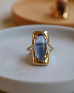 Your new favorite statement ring. A large, long oval, glass cabochon sits in the middle of a soft rectangular design. Low profile and easy to wear. gold plated brass or solid sterling silver amber brown, translucent Czech glass top rectangle measures 1” x .5”