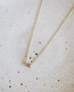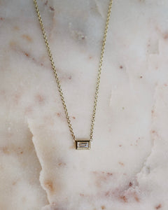 Beautifully handcrafted baguette bezel diamond in 14k gold hanging from a dainty cable link chain. Chic and timeless, wear it by itself or layered, day or night.