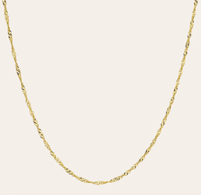 Indulge in luxury with our 14k Gold Tiny Singapore Chain. This dainty chain features twisted shiny links for a delicate and sophisticated look. Elevate any outfit with this exclusive and timeless piece. Enhance your style with elegance and class.