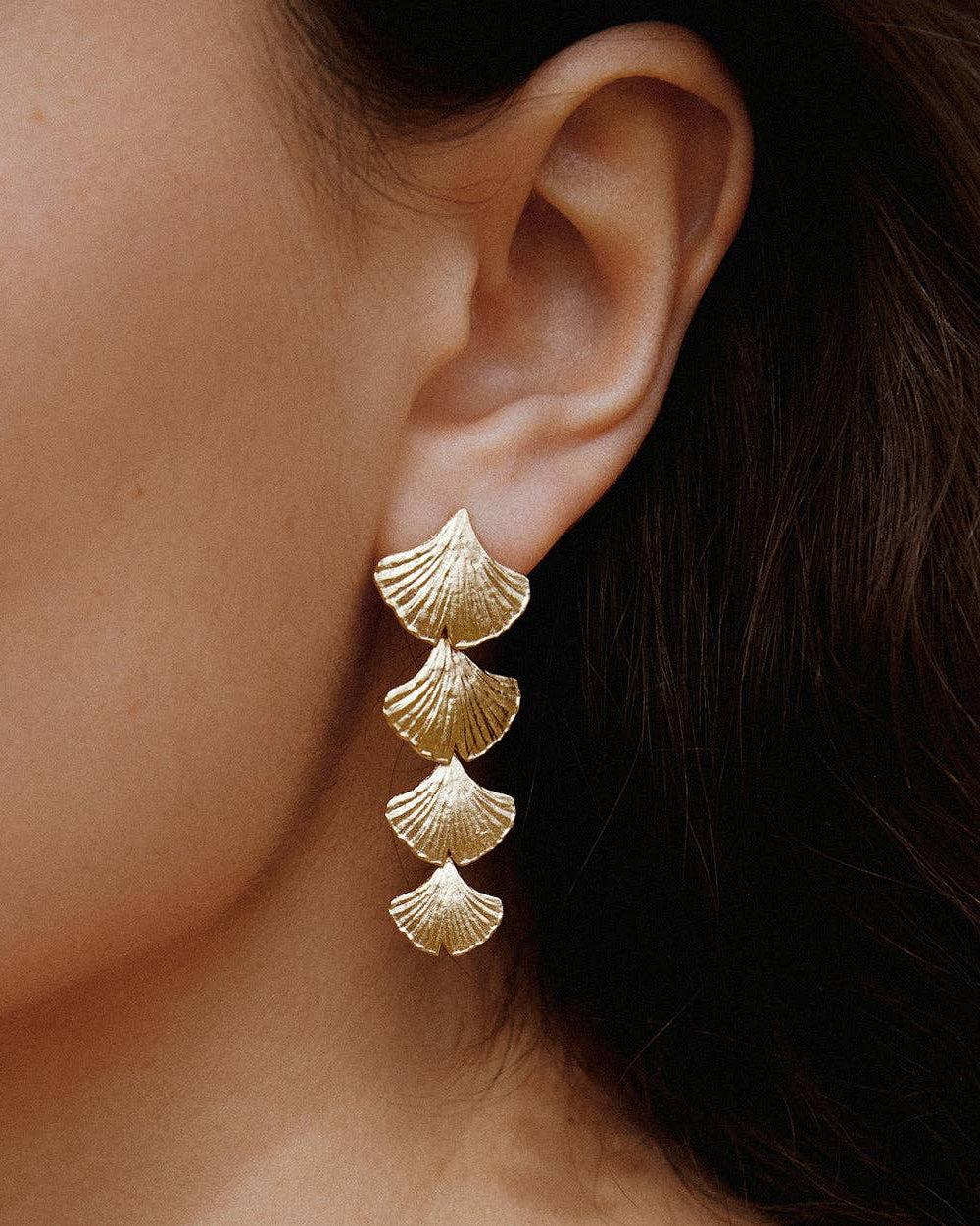 Our golden rendition of the ginkgo tree leaves captures its mesmerizing deep-yellow foliage, as well as its strength, resilience and tranquility. These long dangling and sculptural pendant earrings are a true showstopper. Length : 45 mm Width : 16 mm Gold plated (gilding : satin) Ethically made in France