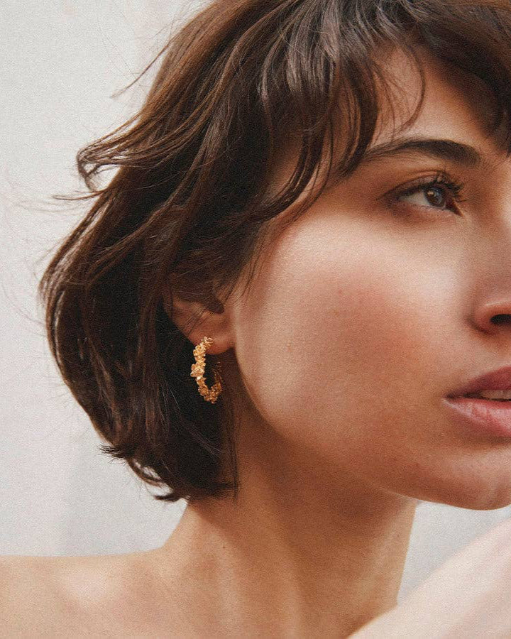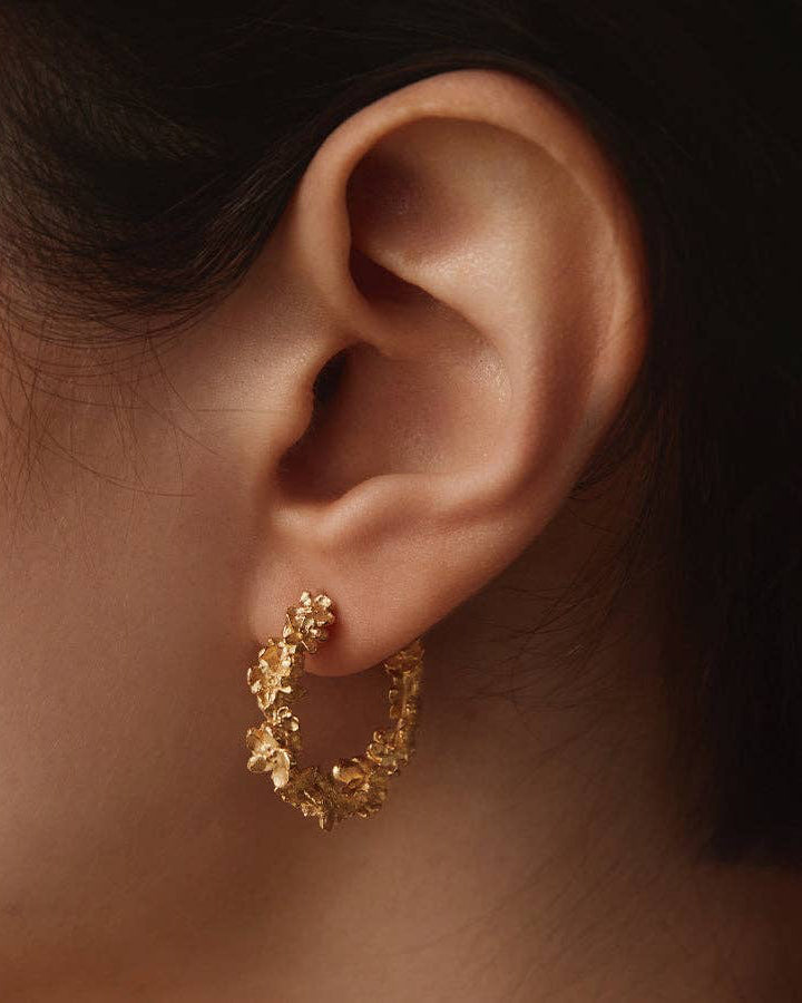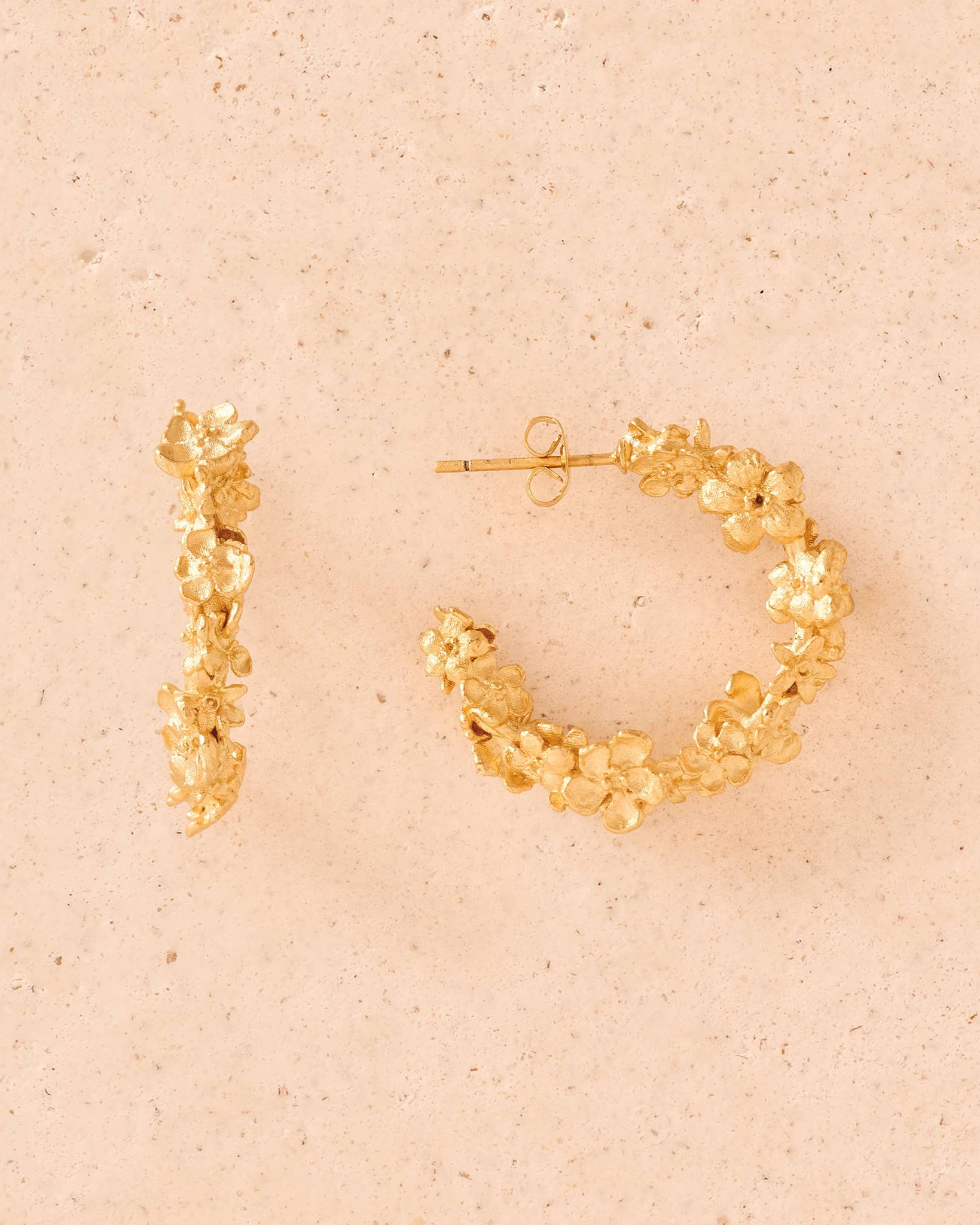 The Kèpos hoop earrings bloom like a garland of flowers entwined along an open branch. Floral and airy, like a summertime garden. Hoop external diameter : 27 mm (1.06") Weight : 3.1 g Gold plated (gilding : satin) Ethically made in France
