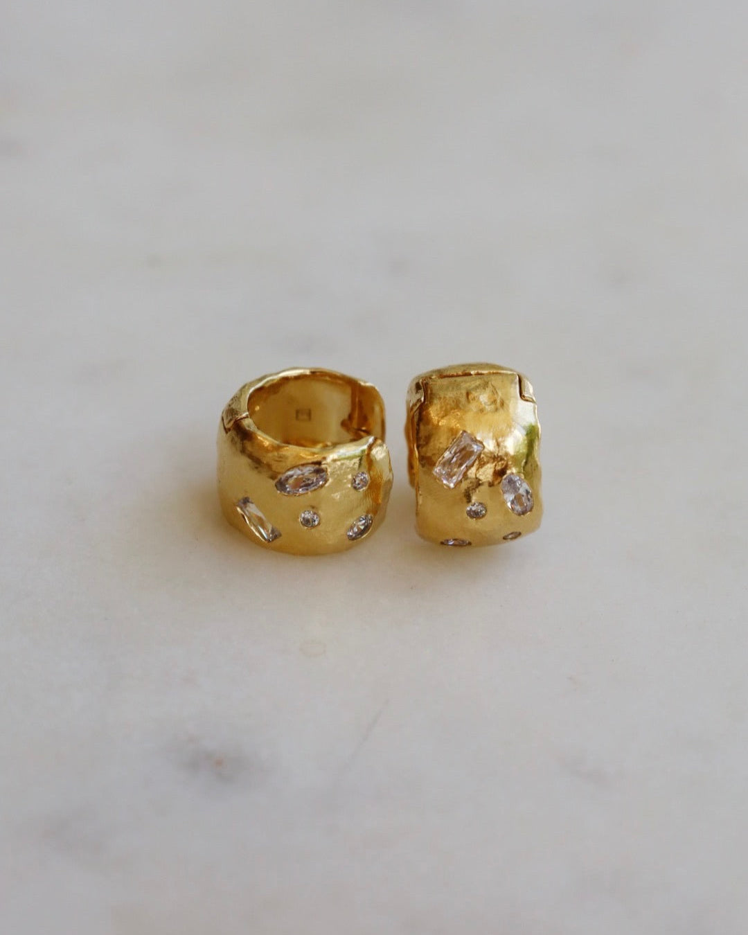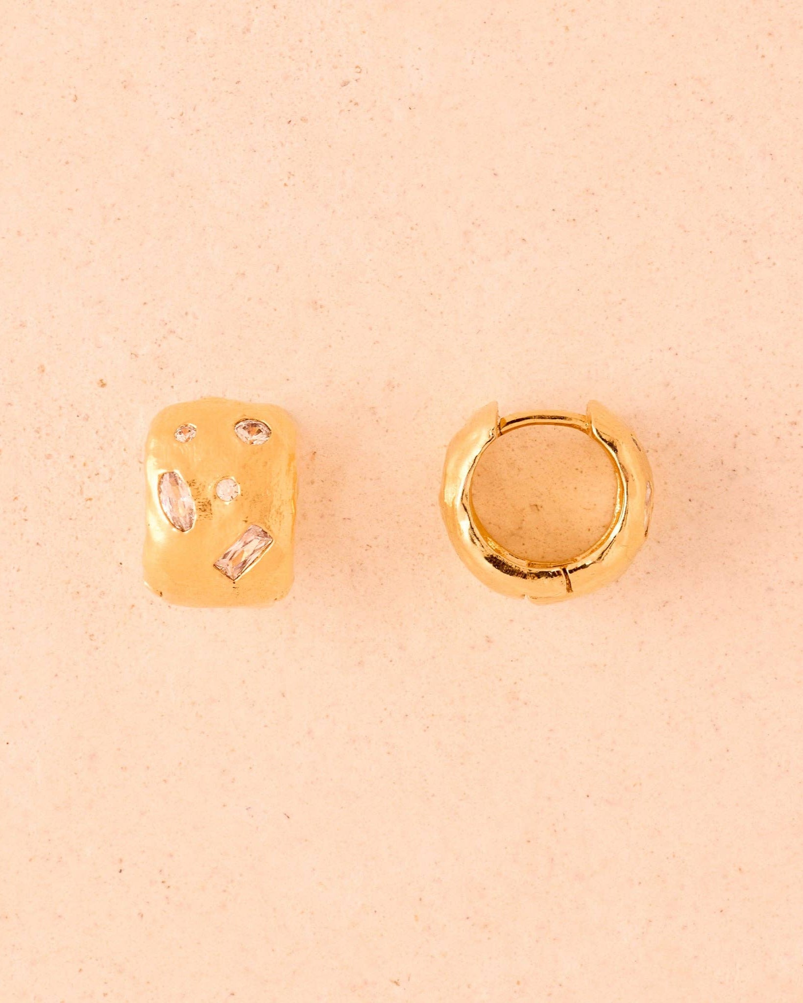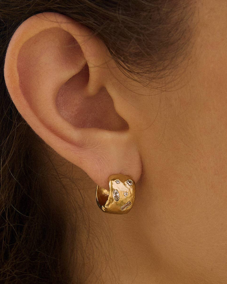 The wide Lucci hoop huggies are hammered and irregular, with a chunky yet lightweight feel. White stones are unevenly set, scattered across the textured gold. Hoop external diameter : 14 mm (0.55") Weight : 3,3 g Stone : White Cubic Zirconia Gold plated (gilding : satin) Ethically made in France
