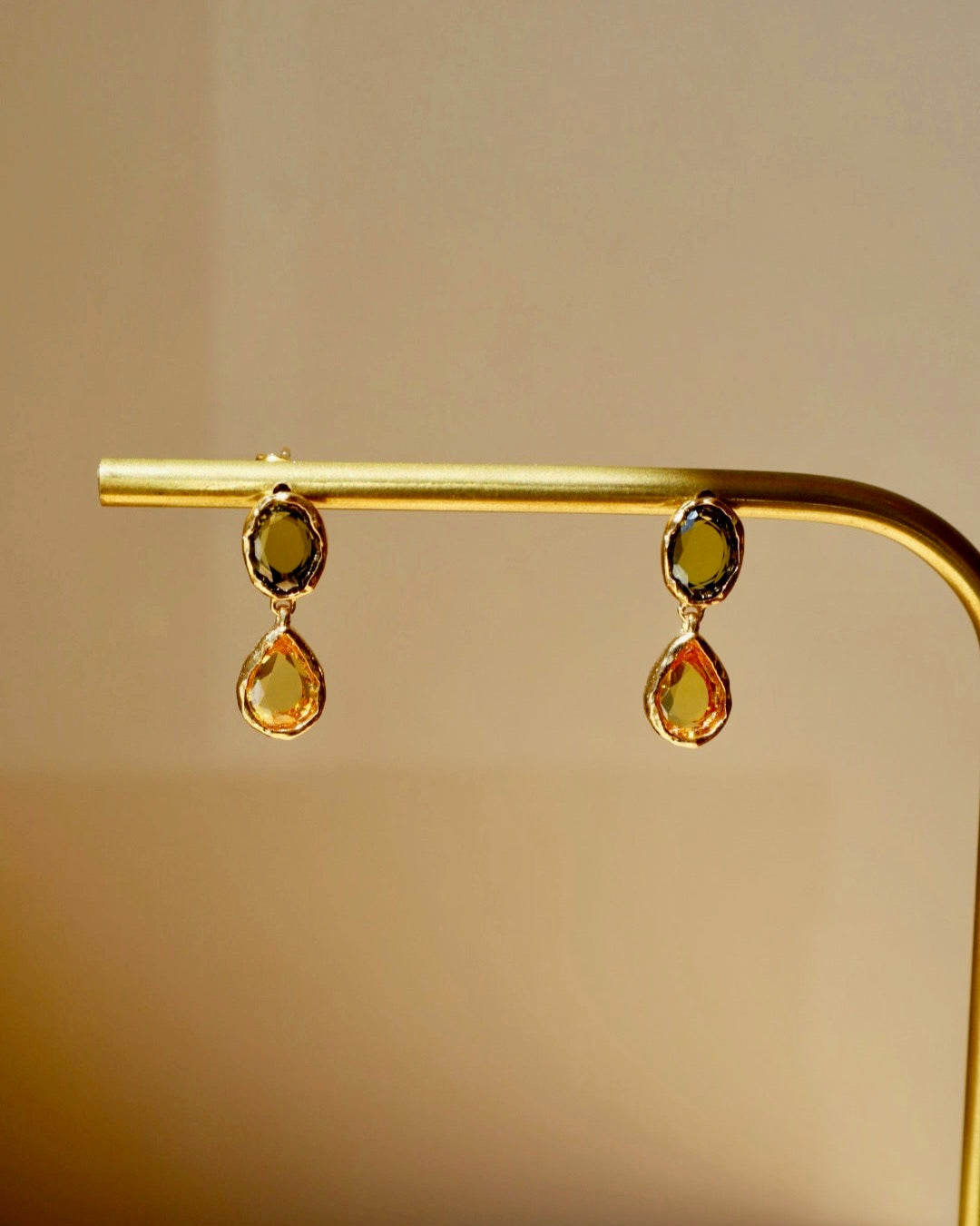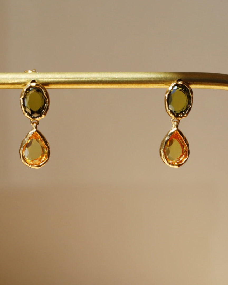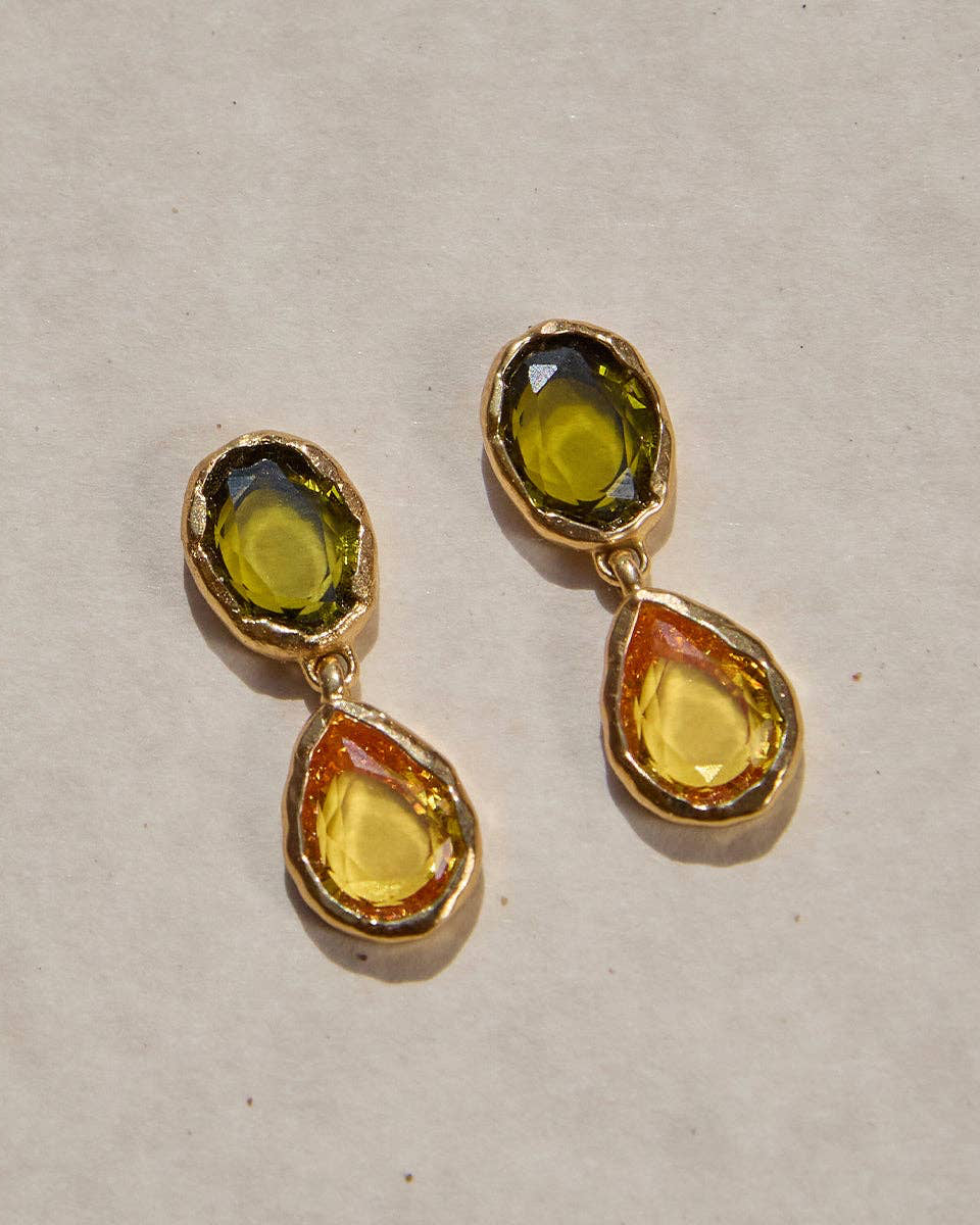 The Pedra drop earrings feature colored stones set in textured gold, with a deep green oval stone suspended above a faceted yellow pear-shaped teardrop. Height : 21 mm (0.83") Width : 7 mm (0.28") Weight : 1,4 g Stone : Dark Green & Yellow Glass stone Gold plated (gilding : satin) Ethically made in France