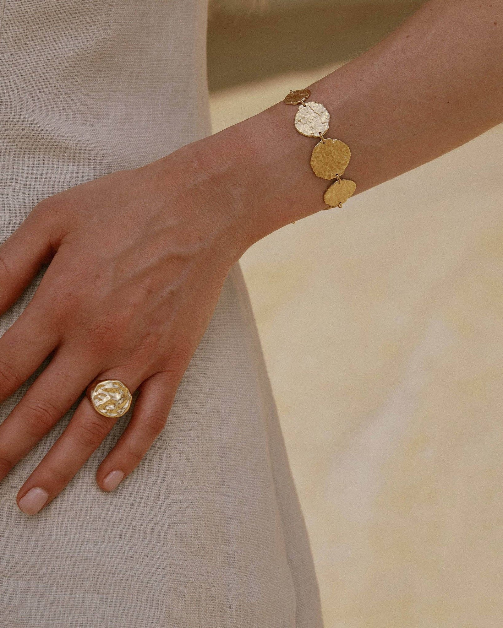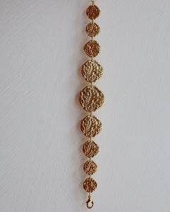 A graduated bracelet featuring 9 hammered golden discs, reminiscent of ancient coin jewelry. 18k gold plated. Chain length : 15 cm (0.59") + 5 cm extender (0.2") Gold gilded (gilding : satin) Ethically made in France