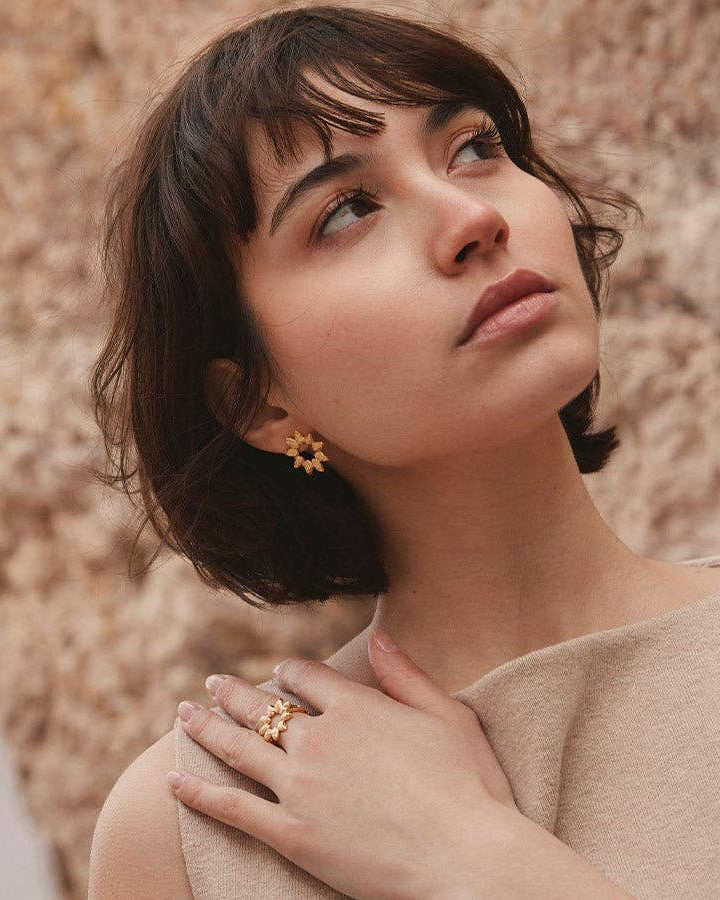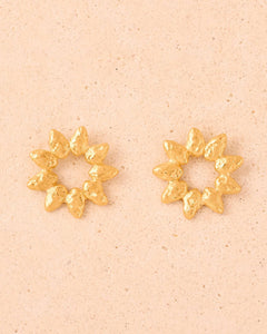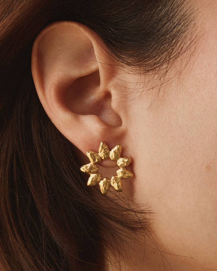 A modern take on floral design, the Hélia earrings are inspired by an open sunflower, featuring large sunray-like petals, a molten surface, and a bold geometric silhouette. Height : 21 mm (0.83") Weight : 2.4 g Gold plated (gilding : satin) Ethically made in France