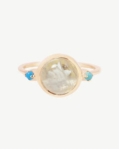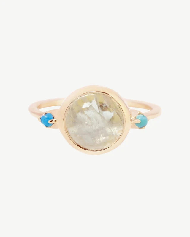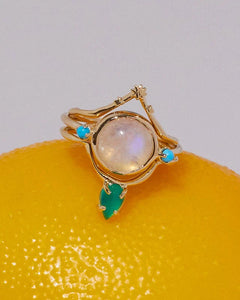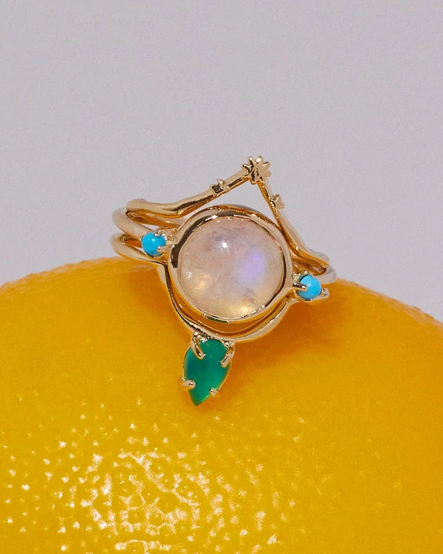 The Hidden Star Ring showcases expertly set rainbow moonstone and turquoise stones, blending their ethereal glow and vibrant hues into a seamless design. This artfully crafted piece offers a subtle yet captivating shimmer, ideal for those who appreciate refined artistry and the unique beauty of natural gemstones. Perfect for elevating any ensemble, it balances elegance with a touch of mystical charm.