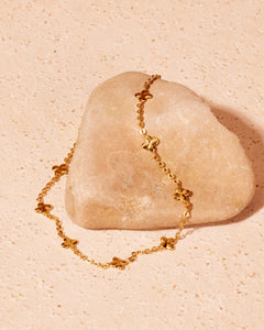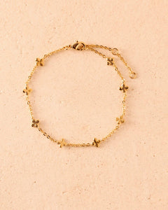 Small golden four-leaf clovers on a fine chain bracelet, with rounded petals and a slightly irregular finish. Chain length : 16 cm (6.3") + 3 cm extender (1.2") Gold plated (gilding : satin) Ethically made in France