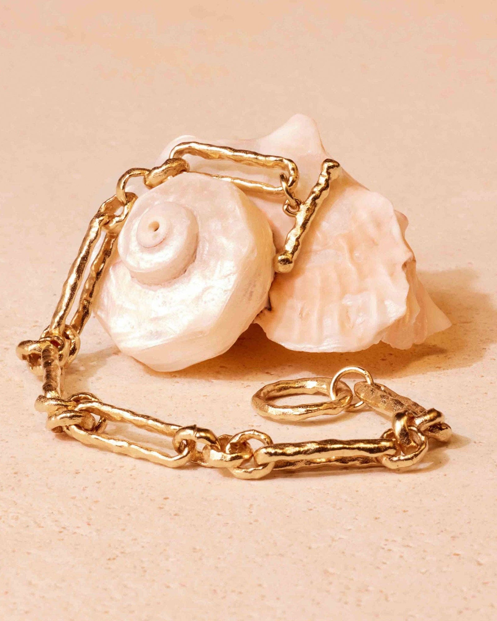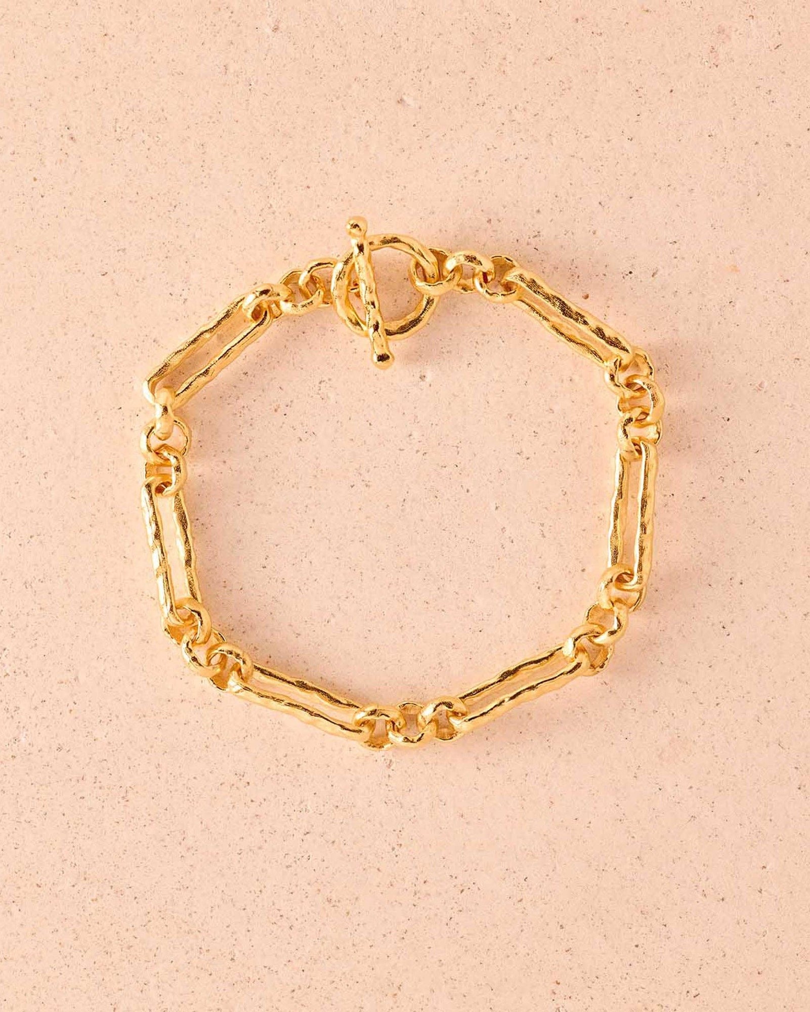 Lavinia is a bar chain necklace with a hammered, irregular design. The elongated rectangular links interlock with smaller rounded ones, and ends with a T-bar clasp. Wear it as a set with the Lavinia necklace. Chain length : 19 mm (0.75") Gold gilded (gilding : satin) Ethically made in France