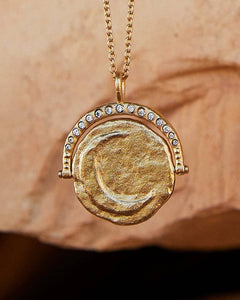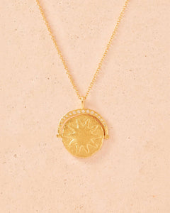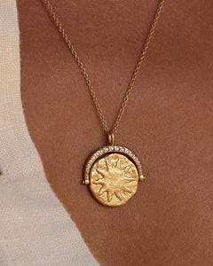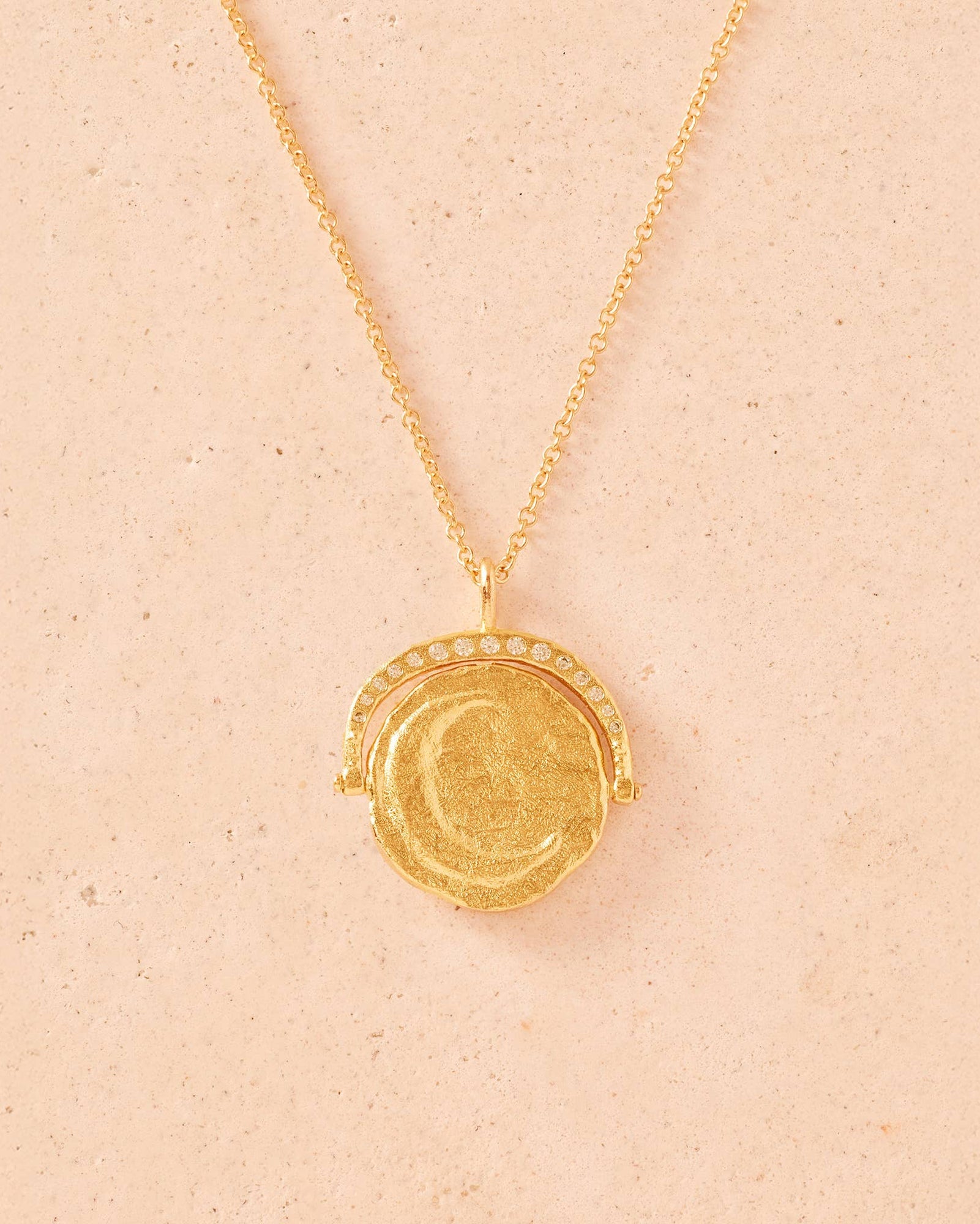 Flip between the sun and the moon, eternal cosmic lovers. Day and night, light and dark, masculine and feminine – linked by a band of star-like inlaid gems, our Sirius rotating round pendant captures the harmony of opposites. This necklace is part of our Kínisi collection, a series of moving and rotating jewelry. Diameter : 20 mm Chain length : 43 cm (16.9") + 7 cm extender (2.8") Stone : White Cubic Zirconia Gold plated (gilding : satin) Ethically made in France