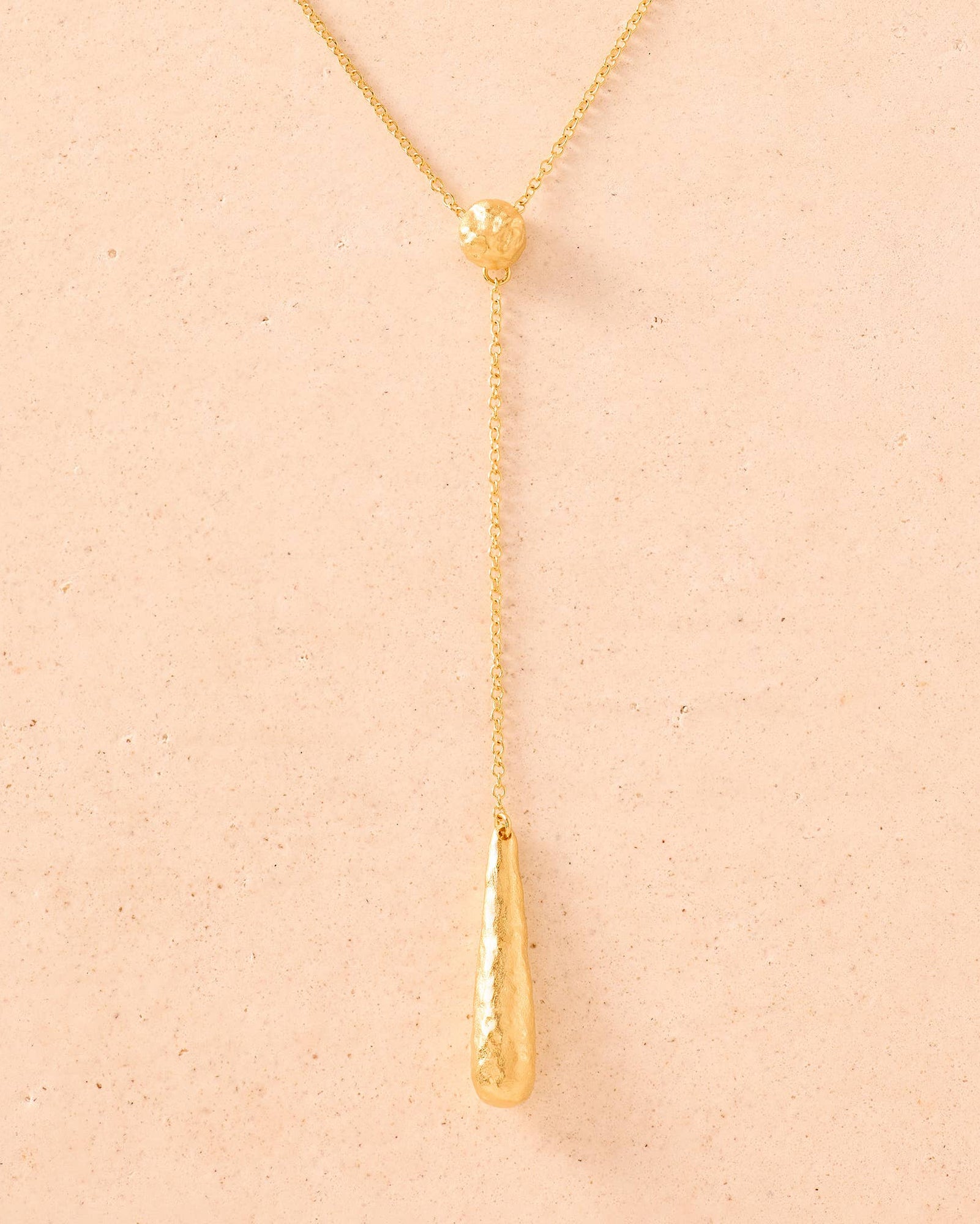 The Stillà lariat sliding necklace reveals a long, hammered drop pendant on a slim chain. Designed for fluidity and movement, a golden nugget shapes the Y and creates the sliding effect. Chain length : 43 cm (16.9") + 7 cm extender (2.8") Pendant height : 80 mm (3.15") Gold plated (gilding : satin) Ethically made in France