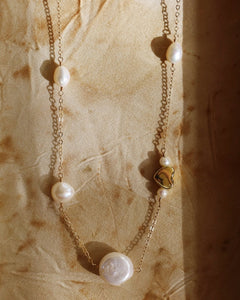 This satellite necklace includes varying sizes of baroque freshwater pearls and a gold accent heart. The perfectly imperfect pearls are connected with a 14k gold fill chain and hand-wrapped wire. The large baroque pearls and gold chain keep it elegant while the gold heart brings a little bit of fun. The Satellite of Love Necklace has an adjustable 16"-18" length gold chain complete with a lobster clasp.