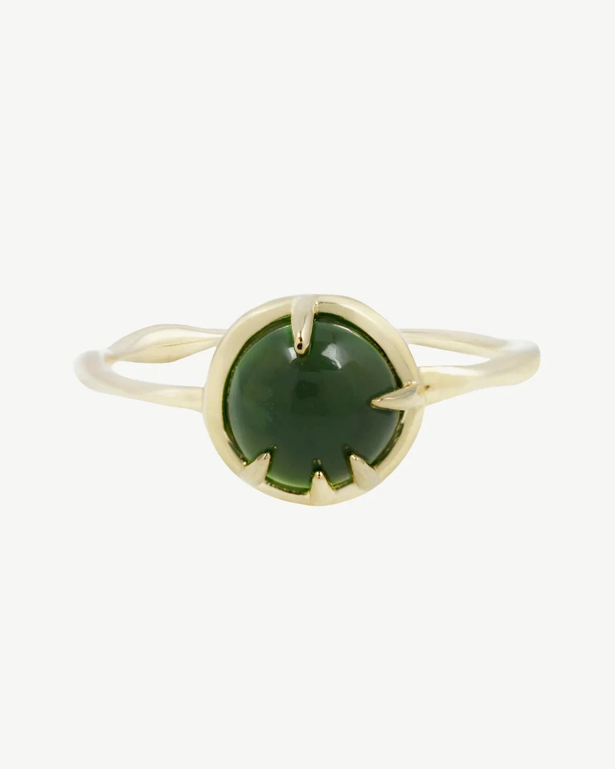 The Fortune Teller Ring features an organic-shaped design with a five-prong setting that elegantly cradles the centerpiece. Its form evokes the mesmerizing experience of gazing into a crystal ball, blending artistry with subtle symbolism. This ring offers a refined statement piece for those who appreciate unique craftsmanship and a touch of mystique in their jewelry collection.