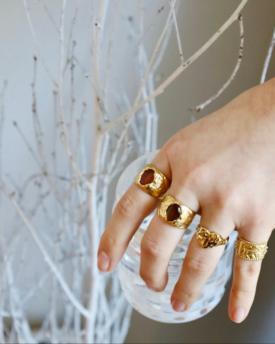 Stand out with our chunky Livia heart-shaped signet ring. With a sculptural, almost abstract heart centerpiece and its hammered finish, this modern piece feels timeless. A bold, rough and powerful reminder of love. Width : 12 mm (0.47") Inside diameter : see size guide Non-adjustable and available in 3 sizes Gold plated (gilding : satin)