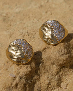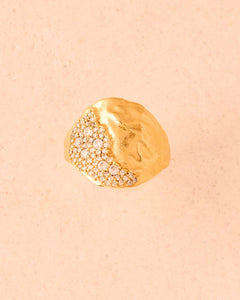 A large round ring that wraps around the finger, its textured gold melting like a wave over irregularly scattered white stones. Width : 18 mm (0.71") Inside diameter