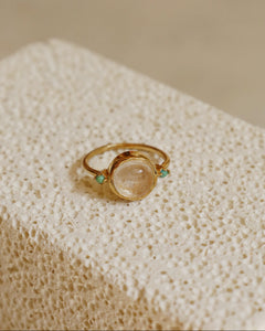 The Hidden Star Ring showcases expertly set rainbow moonstone and turquoise stones, blending their ethereal glow and vibrant hues into a seamless design. This artfully crafted piece offers a subtle yet captivating shimmer, ideal for those who appreciate refined artistry and the unique beauty of natural gemstones. Perfect for elevating any ensemble, it balances elegance with a touch of mystical charm.