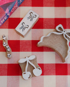 Box size: H - 11" x W - 8.5" x D - 2.5" BOX INCLUDES: - Four hand carved wooden blocks (Indian Blackberry Wood). - Blocks include; Bow, Cherry, Floral Border, Bow Border - One handcrafted cotton tote bag designed for everyday use (13.5 x 15.5”, handle drop length - 10”). - Five bottles of non-toxic, acrylic block printing inks in black, white, red, blue, and yellow (0.84 fl oz / 25ml). - One rubber brayer for smooth application. - One paintbrush with natural uncoated wooden handle. - One acrylic ink plate. - One block printing guide filled with tips and ideas. Fair Tr
