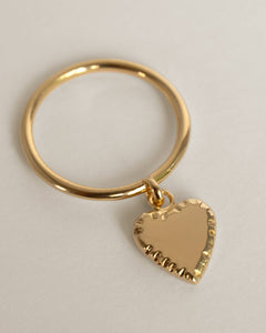 This gold-plated brass ring showcases a delicate 10mm heart suspended via a soldered jump ring, introducing dynamic motion and romantic appeal to any ring collection with understated sophistication.