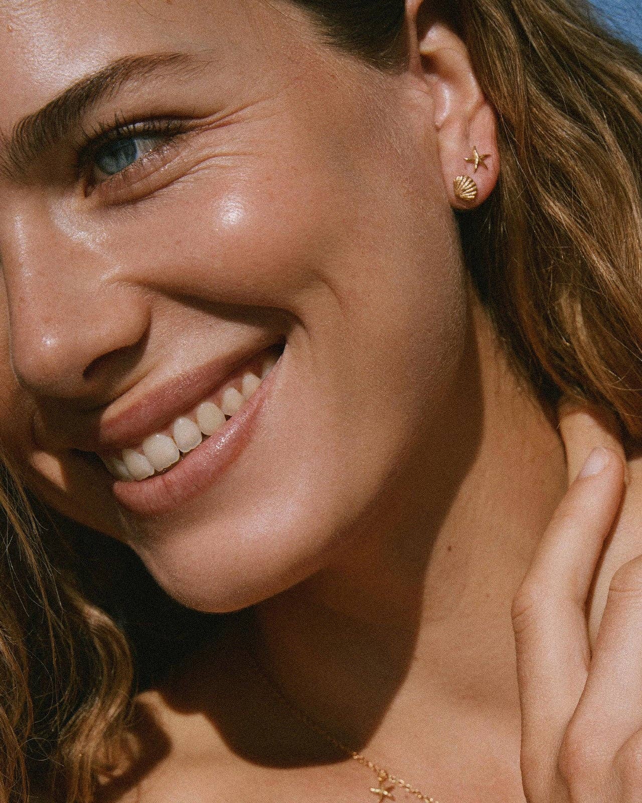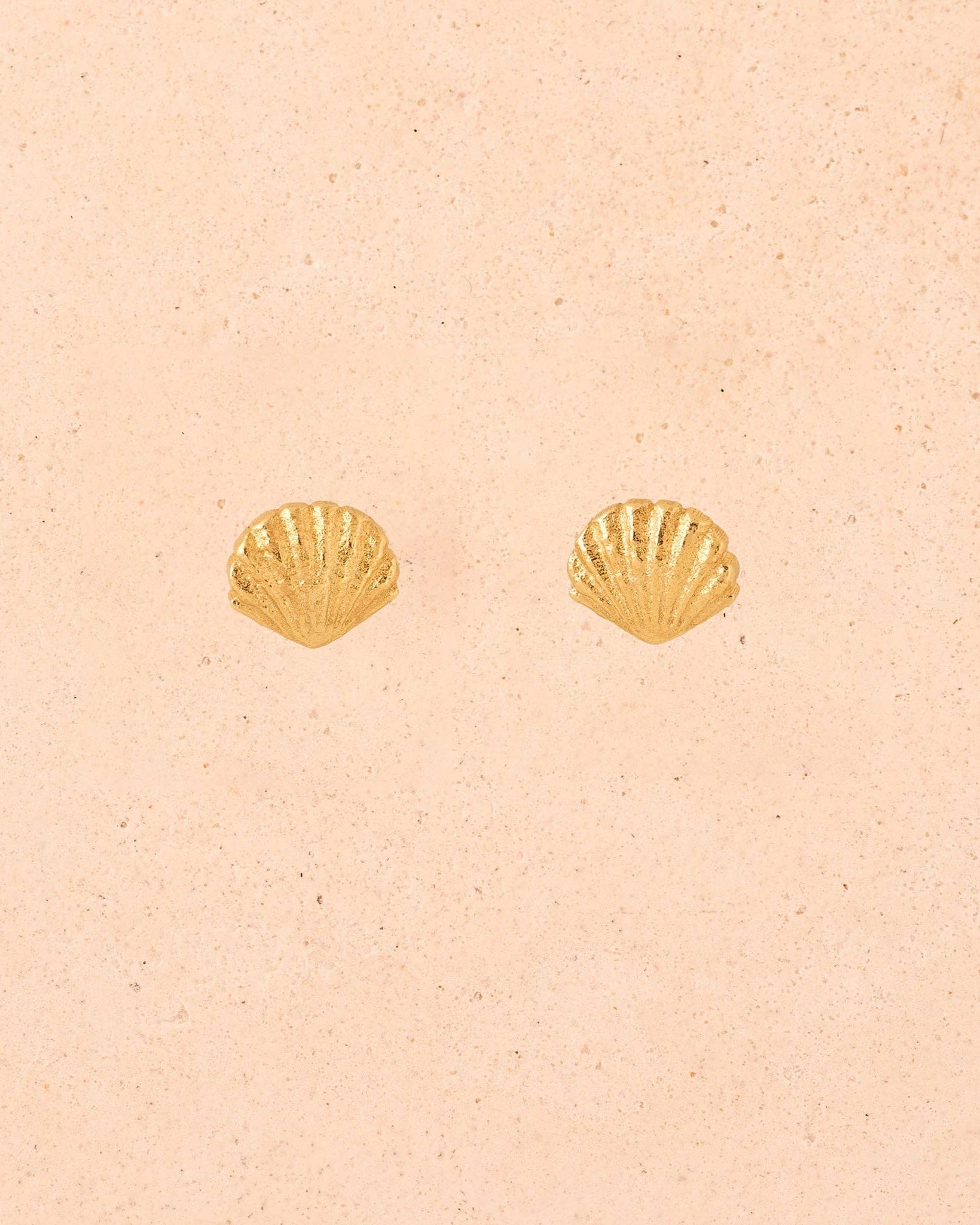 Small, detailed seashell stud earrings, with scalloped edges. Their symmetrical shape, soft ridges and wavy surface echo those of the shells washed ashore. Height : 6 mm (0.24") Width : 7 mm (0.28") Weight : 0,6 g Gold plated (gilding : satin)