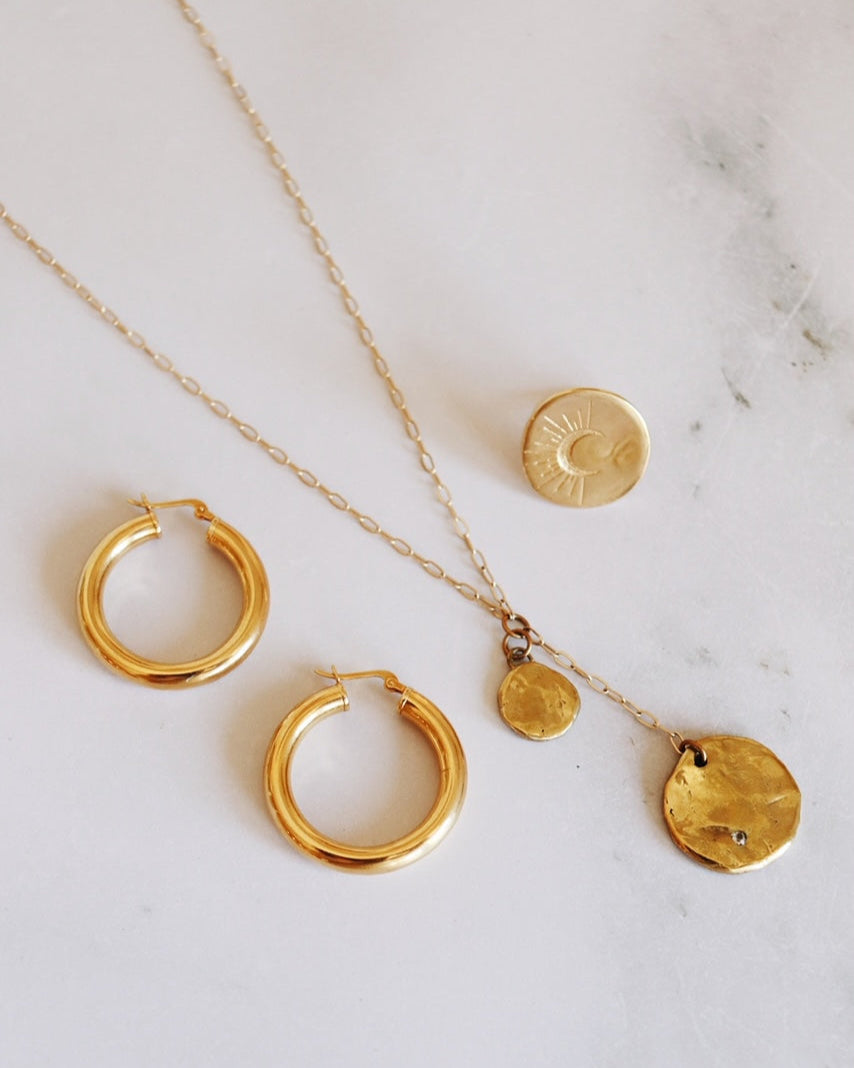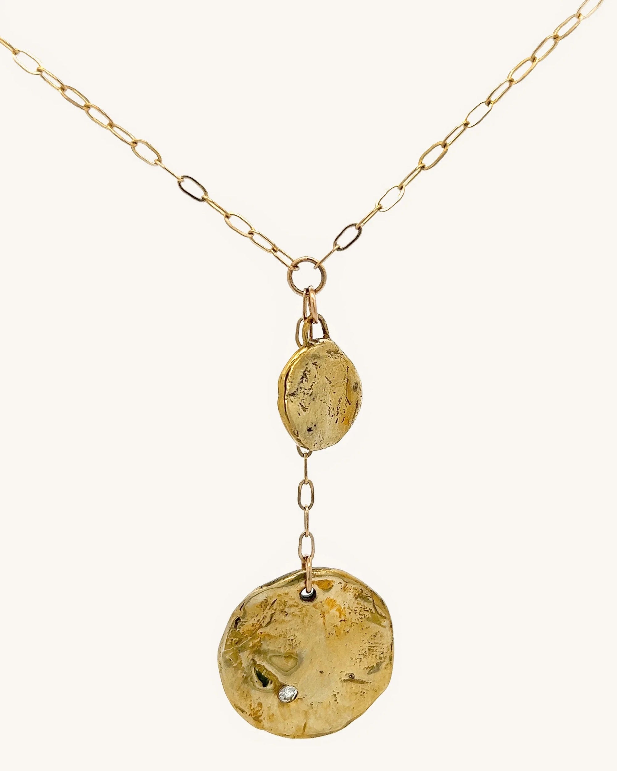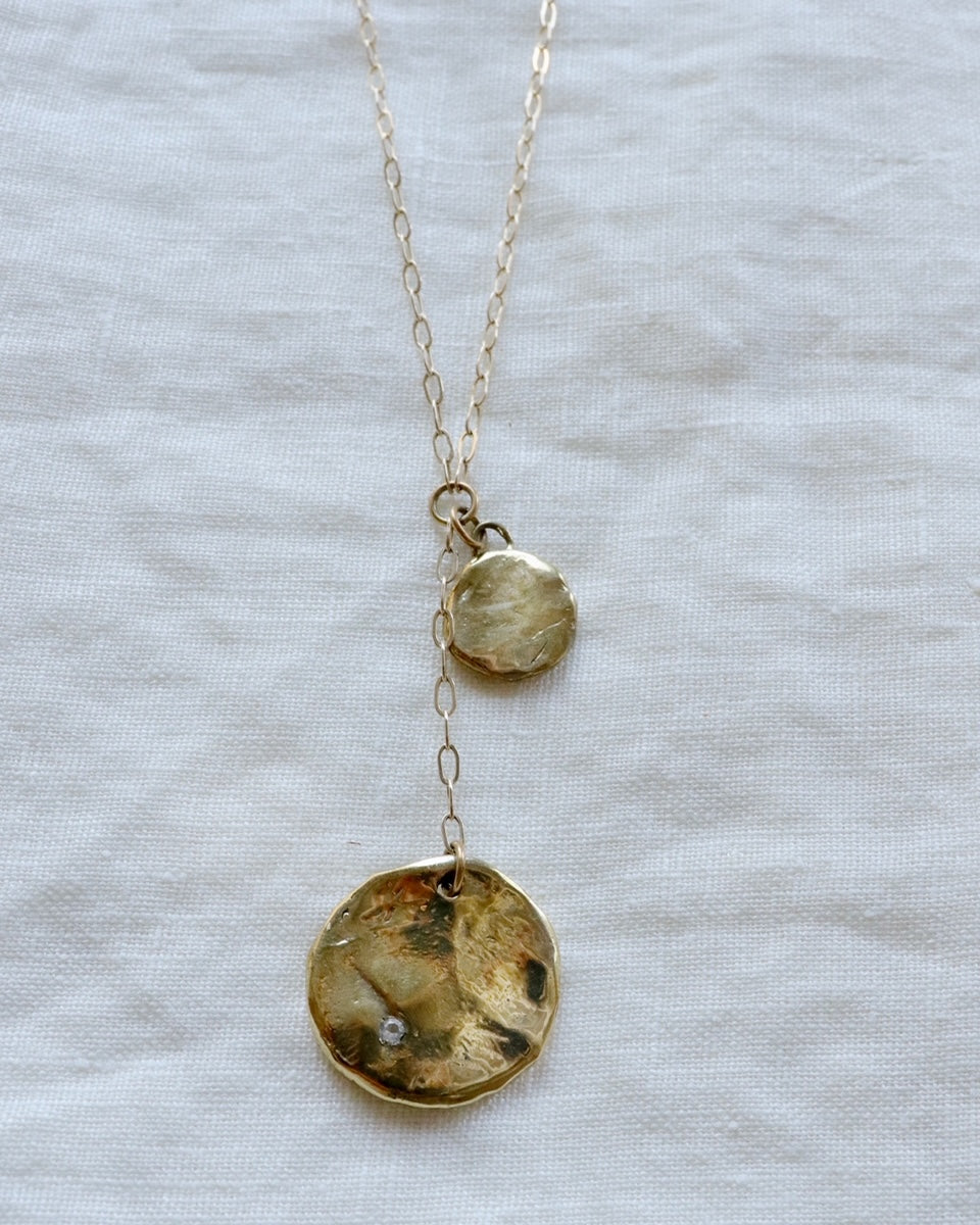 Let your style shine like the stars with the Andromeda Gold Lariat Necklace! Featuring two textured gold medallions that look like moons and a flush set white topaz, this stunning lariat is one of a kind. Perfect for a night out or just to show off your stellar style!