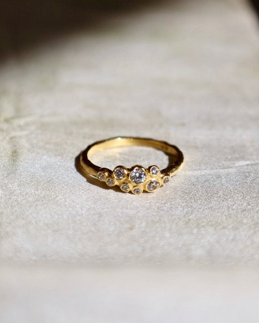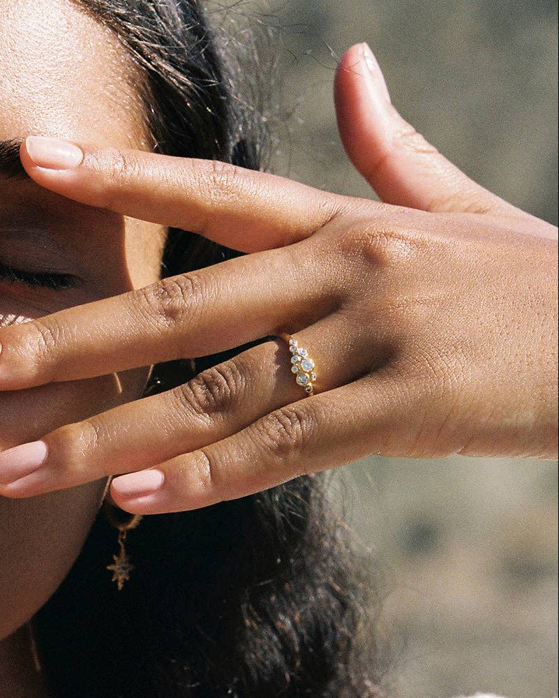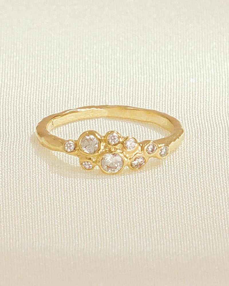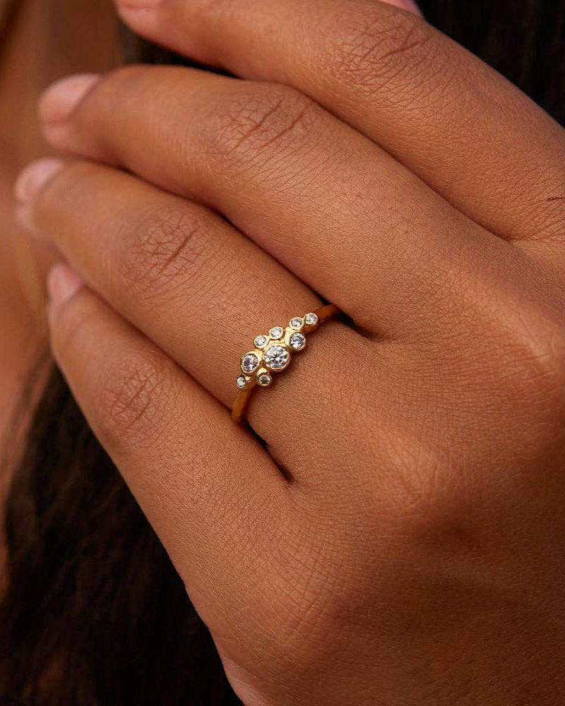 Our Atys slim cluster ring has an organic and timeless charm, with irregularly inlaid white stones. It captures the untamed beauty of where rugged cliffs meet the sea. Width : 6 mm (0.24") Inside diameter : see size guide Non-adjustable and available in 3 sizes Stone : White Cubic Zirconia Gold plated (gilding : satin) Ethically made in France
