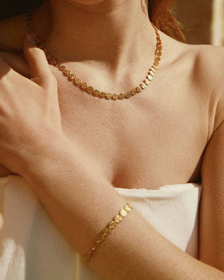This necklace is composed of a sequence of small, hammered gold discs, creating a continuous design, reminiscent of ancient coin jewelry. Wear it as a set with the Caius bracelet. Chain length : 43 cm (16.9") + 7 cm extender (2.8") Gold gilded (gilding : satin)