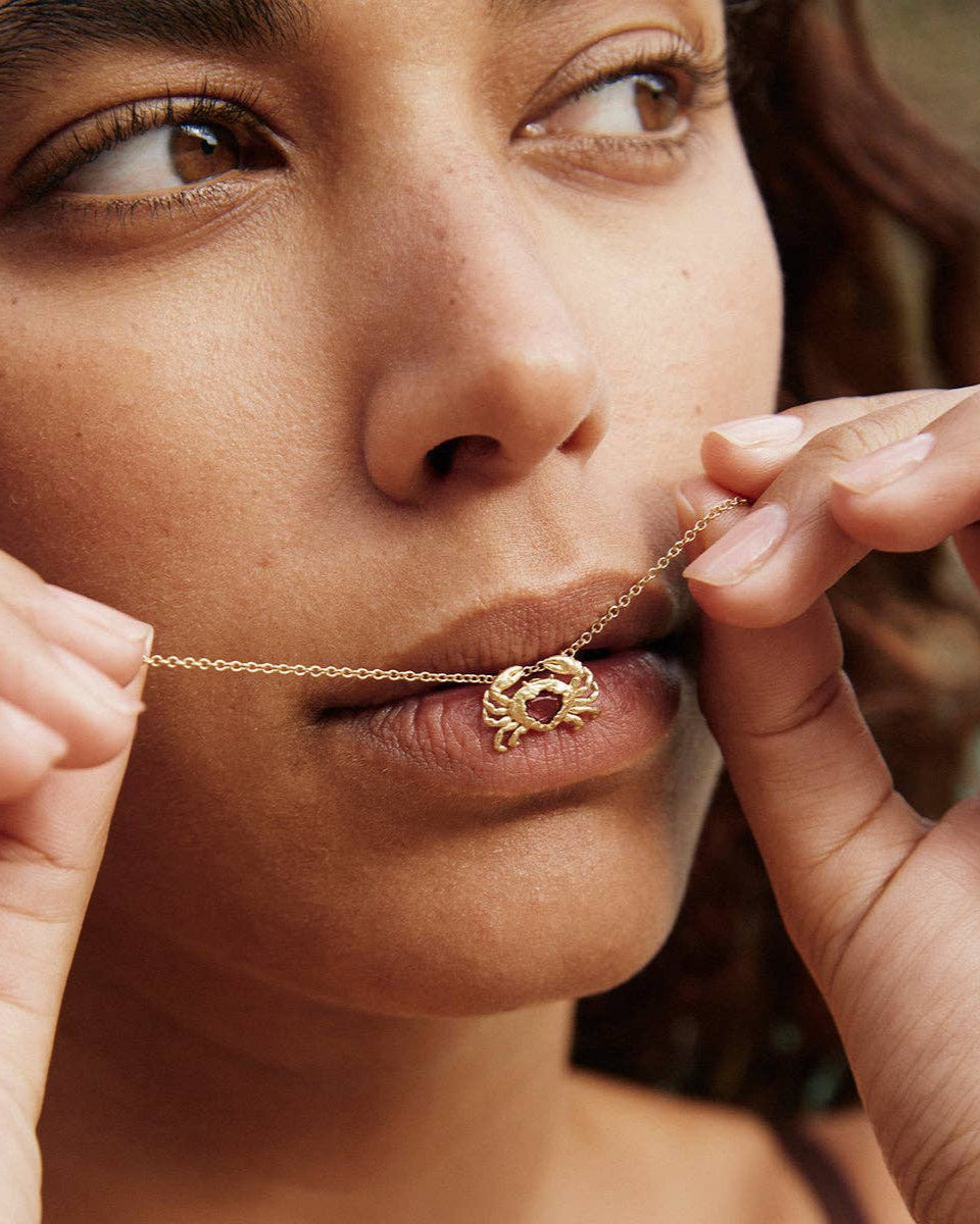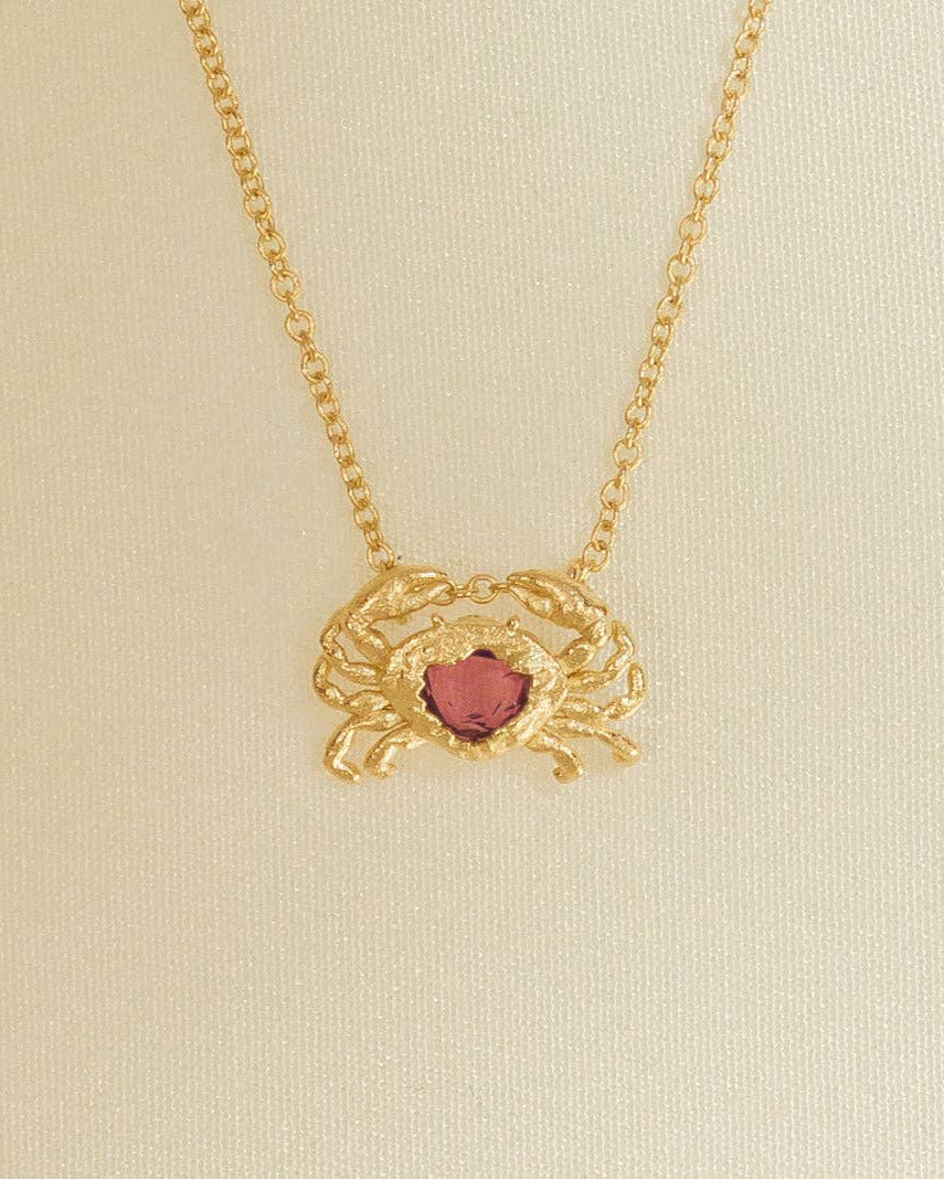 Wear this small crab pendant and its delicate red stone heart around your neck, and feel its protective power. Length : 10 mm Width : 15 mm Chain length : 43 cm (16.9"") + 7 cm extender (2.8"") Stone : Rosewood Glass stone Gold plated (gilding : satin)