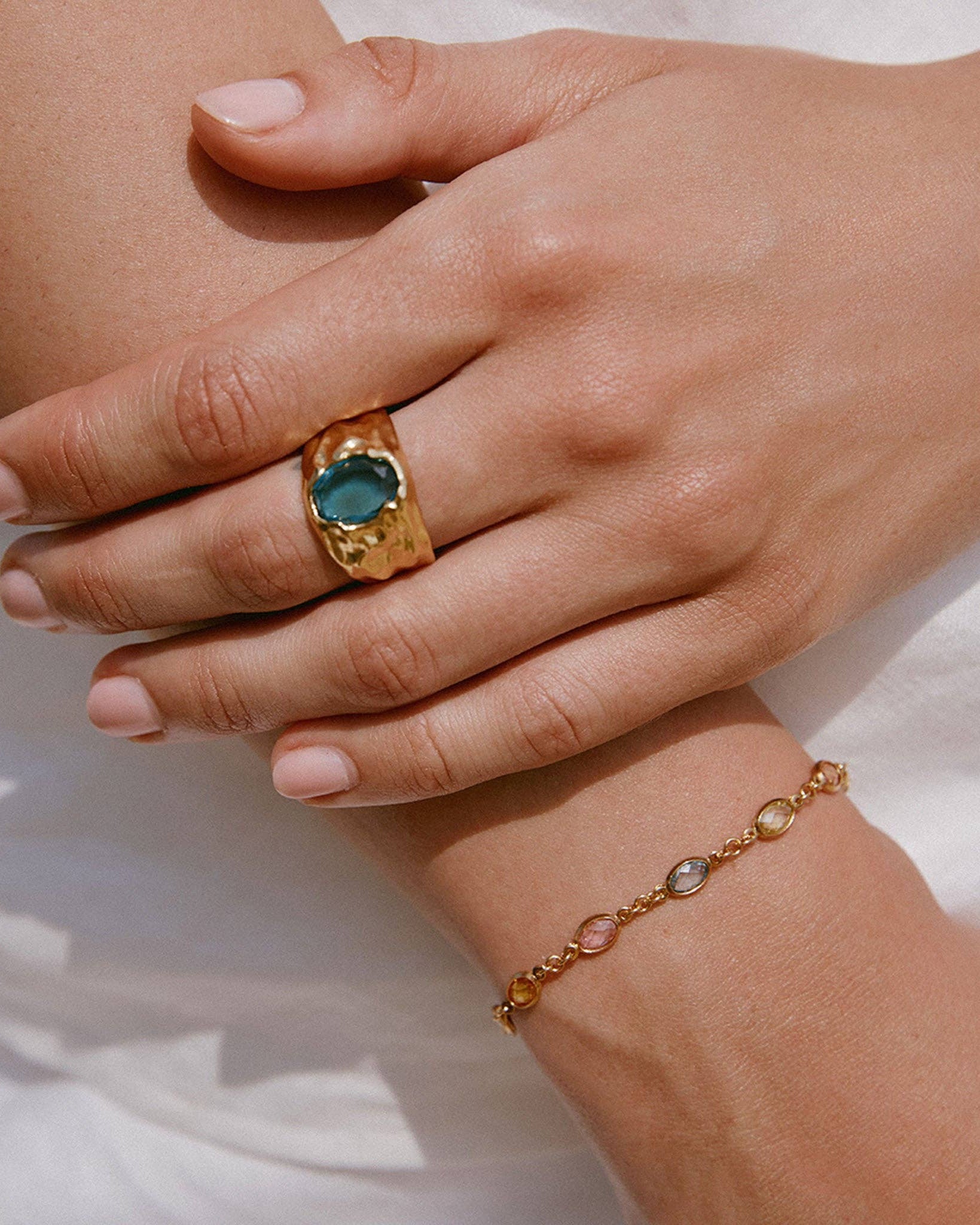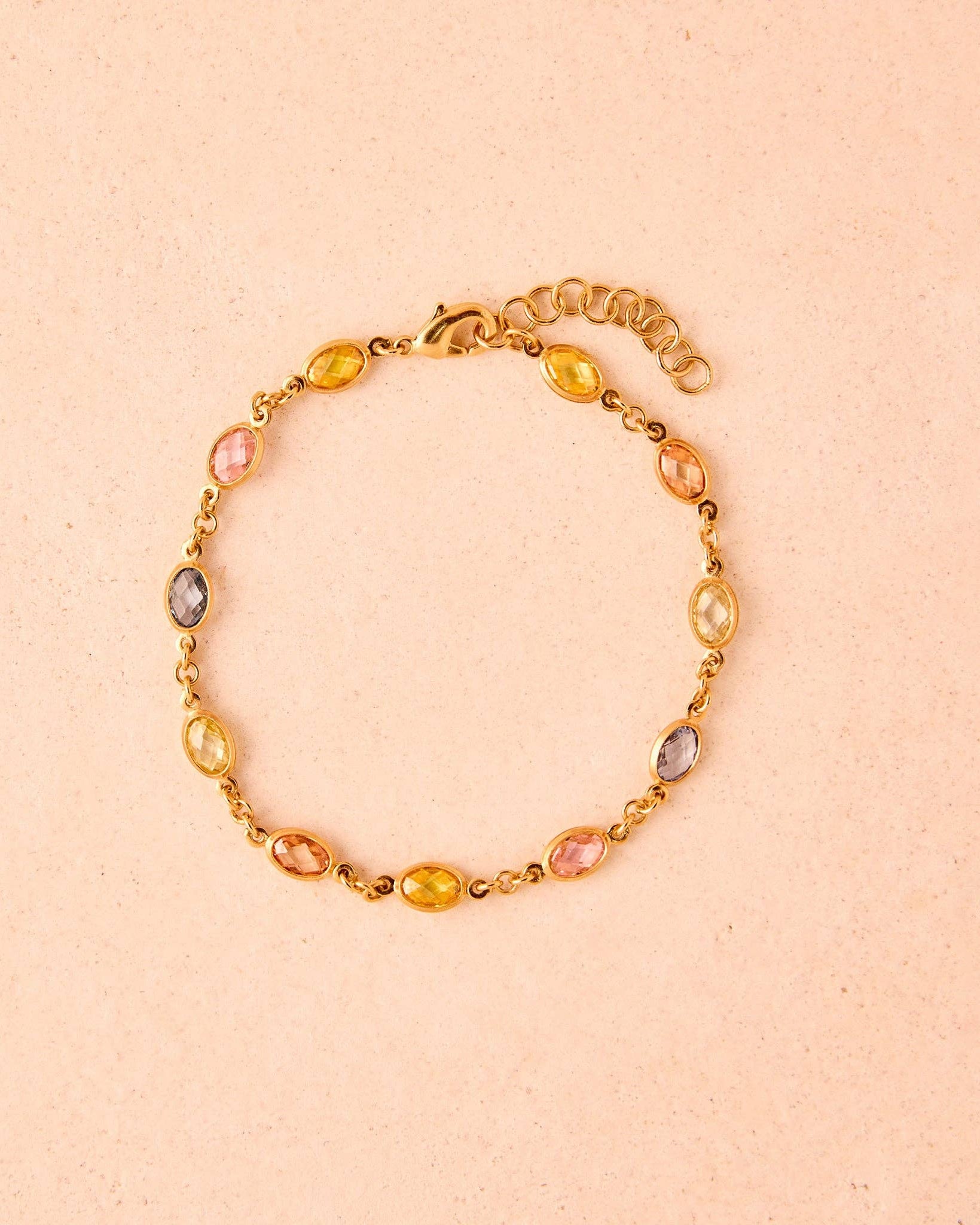 Alternating multicolored stones set on a fine chain, in bright shades of yellow, soft pink, light blue, orange, and pale green. Wear it as a set with the Fruitera necklace. Chain length : 16 cm (6.3") + 3 cm extender (1.2") Stone : Multi Color Cubic Zirconia Gold gilded (gilding : satin) Ethically made in France