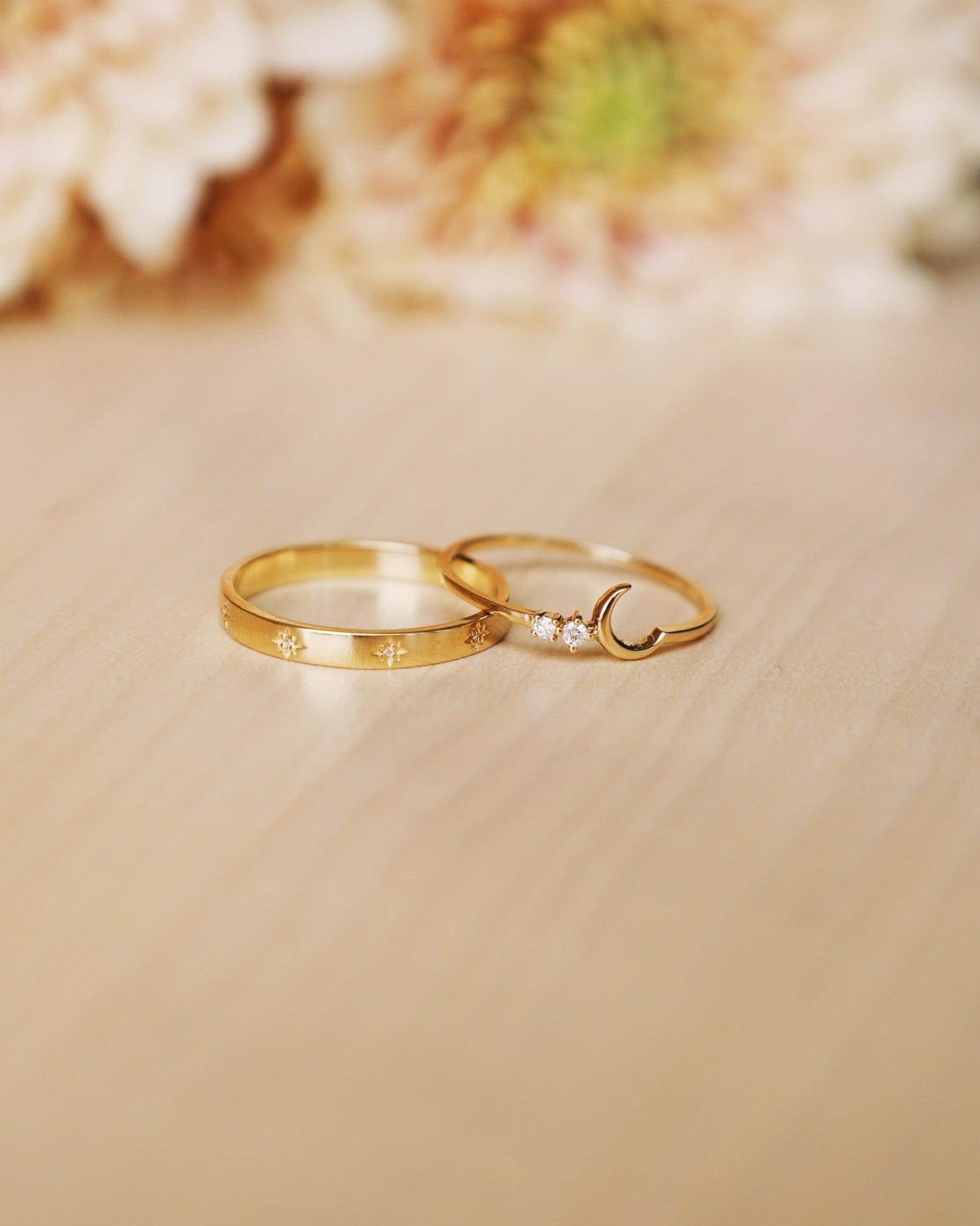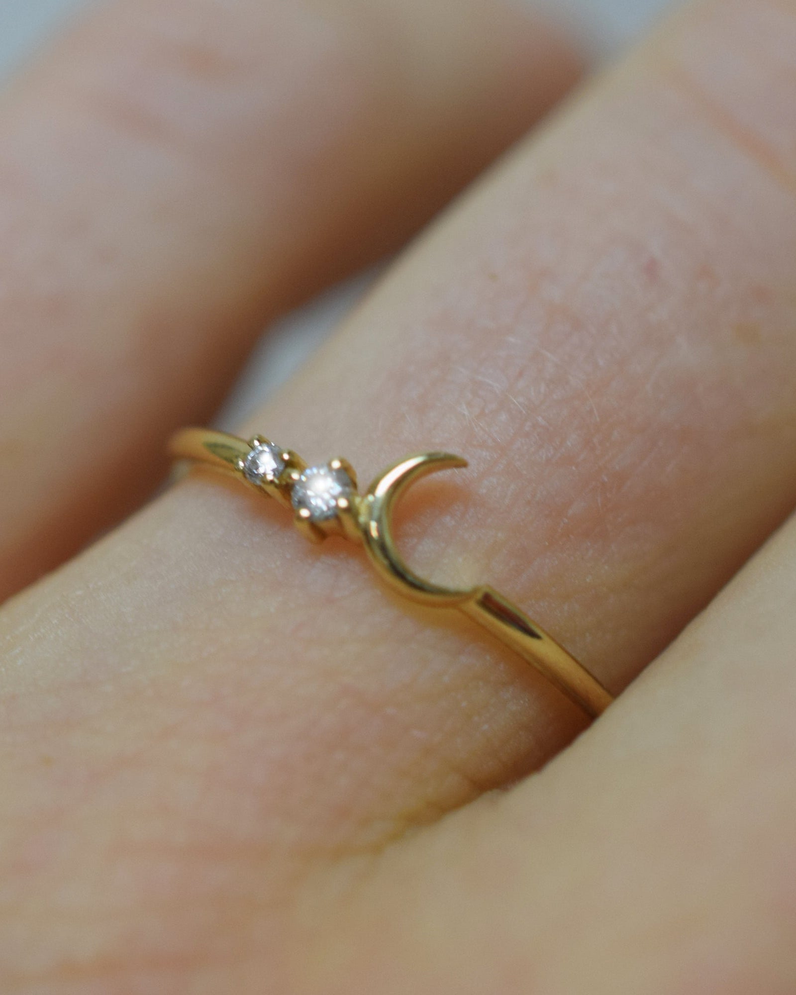 A whimsical crescent moon ring with two delicate diamonds creates this asymmetrical stunner. It's unique yet minimal design make it perfect for stacking or wearing as a stand-alone piece.